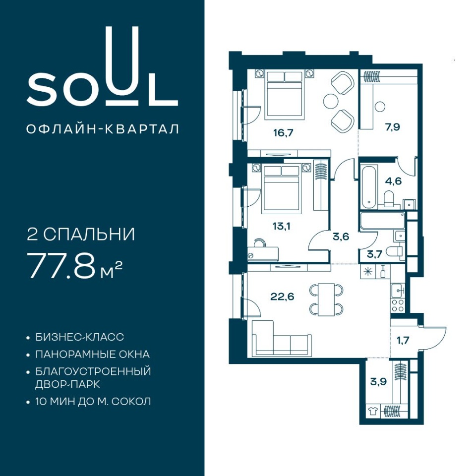 Цены указаны с условием 100% оплаты и стандартной ипотеки. Прямая продажа от застройщика. Продается 2-к. квартира номер 250 общей площадью 77.8 кв.м. на 21-м этаже 21 этажного дома, Корпус 1. С предчистовой отделкой. Проект бизнес-класса СОУЛ от девелопера FORMA. До метро Сокол 10 мин пешком. Архитектура от британского бюро SimpsonHaugh. Благоустройство дворов — Gillespies и GAFA. Территория состоит из культурного парка и приватных дворов. Озеленение в эстетике лесного оазиса. Насыщенное благоустройство: прогулочные тропинки, релакс-зоны, пряный и сенсорный сады, развивающие детские площадки и воркауты. В центре проекта объект культурного наследия — общественное пространство Изофабрика, построенная в 30-х годах по проекту архитектора Георгия Гольца. Здесь будут располагаться мастерские для взрослых и детей, выставочные залы, коворкинги, образовательный центр, рестораны и кафе. Квартиры с панорамными окнами, мастер-спальнями, гардеробными, классическими балконами и лоджиями, видовыми террасами. Высота потолков от 2,9 до 3,5 м. В проекте 2 детских сада на 100 и 200 малышей. Клубная гостиная, фитнес-комната, детская игровая комната, дизайнерские лобби, подземный паркинг и кладовые.