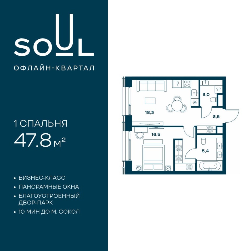 Цены указаны с условием 100% оплаты и стандартной ипотеки. Прямая продажа от застройщика. Продается 1-к. квартира номер 165 общей площадью 47.8 кв.м. на 19-м этаже 25 этажного дома, Корпус 3. С отделкой White Box Max. Проект бизнес-класса SOUL от девелопера FORMA. До метро Сокол 10 мин пешком. Архитектура от британского бюро SimpsonHaugh. Благоустройство дворов — Gillespies и GAFA. Территория состоит из культурного парка и приватных дворов. Озеленение в эстетике лесного оазиса. Насыщенное благоустройство: прогулочные тропинки, релакс-зоны, пряный и сенсорный сады, развивающие детские площадки и воркауты. В центре проекта объект культурного наследия — общественное пространство Изофабрика, построенная в 30-х годах по проекту архитектора Георгия Гольца. Здесь будут располагаться мастерские для взрослых и детей, выставочные залы, коворкинги, образовательный центр, рестораны и кафе. Квартиры с панорамными окнами, мастер-спальнями, гардеробными, классическими балконами и лоджиями, видовыми террасами. Высота потолков от 2,9 до 3,5 м. В проекте 2 детских сада на 100 и 200 малышей. Клубная гостиная, фитнес-рум, детская игровая комната, дизайнерские лобби, подземный паркинг и келлеры.