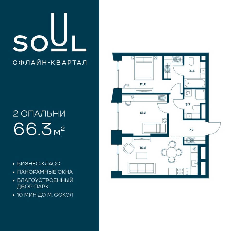 Цены указаны с условием 100% оплаты и стандартной ипотеки. Прямая продажа от застройщика. Продается 2-к. квартира номер 396 общей площадью 66.3 кв.м. на 17-м этаже 27 этажного дома, Корпус 4. С отделкой White Box Max. Проект бизнес-класса SOUL от девелопера FORMA. До метро Сокол 10 мин пешком. Архитектура от британского бюро SimpsonHaugh. Благоустройство дворов — Gillespies и GAFA. Территория состоит из культурного парка и приватных дворов. Озеленение в эстетике лесного оазиса. Насыщенное благоустройство: прогулочные тропинки, релакс-зоны, пряный и сенсорный сады, развивающие детские площадки и воркауты. В центре проекта объект культурного наследия — общественное пространство Изофабрика, построенная в 30-х годах по проекту архитектора Георгия Гольца. Здесь будут располагаться мастерские для взрослых и детей, выставочные залы, коворкинги, образовательный центр, рестораны и кафе. Квартиры с панорамными окнами, мастер-спальнями, гардеробными, классическими балконами и лоджиями, видовыми террасами. Высота потолков от 2,9 до 3,5 м. В проекте 2 детских сада на 100 и 200 малышей. Клубная гостиная, фитнес-рум, детская игровая комната, дизайнерские лобби, подземный паркинг и келлеры.