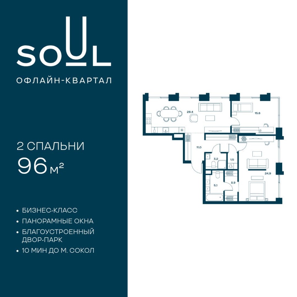 Цены указаны с условием 100% оплаты и стандартной ипотеки. Прямая продажа от застройщика. Продается 2-к. квартира номер 470 общей площадью 96 кв.м. на 27-м этаже 27 этажного дома, Корпус 4. С отделкой White Box Max. Проект бизнес-класса SOUL от девелопера FORMA. До метро Сокол 10 мин пешком. Архитектура от британского бюро SimpsonHaugh. Благоустройство дворов — Gillespies и GAFA. Территория состоит из культурного парка и приватных дворов. Озеленение в эстетике лесного оазиса. Насыщенное благоустройство: прогулочные тропинки, релакс-зоны, пряный и сенсорный сады, развивающие детские площадки и воркауты. В центре проекта объект культурного наследия — общественное пространство Изофабрика, построенная в 30-х годах по проекту архитектора Георгия Гольца. Здесь будут располагаться мастерские для взрослых и детей, выставочные залы, коворкинги, образовательный центр, рестораны и кафе. Квартиры с панорамными окнами, мастер-спальнями, гардеробными, классическими балконами и лоджиями, видовыми террасами. Высота потолков от 2,9 до 3,5 м. В проекте 2 детских сада на 100 и 200 малышей. Клубная гостиная, фитнес-рум, детская игровая комната, дизайнерские лобби, подземный паркинг и келлеры.
