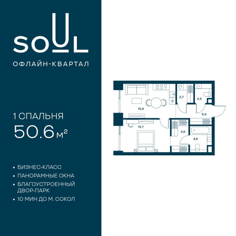 Цены указаны с условием 100% оплаты и стандартной ипотеки. Прямая продажа от застройщика. Продается 1-к. квартира номер 407 общей площадью 50.6 кв.м. на 18-м этаже 27 этажного дома, Корпус 4. С отделкой White Box Max. Проект бизнес-класса SOUL от девелопера FORMA. До метро Сокол 10 мин пешком. Архитектура от британского бюро SimpsonHaugh. Благоустройство дворов — Gillespies и GAFA. Территория состоит из культурного парка и приватных дворов. Озеленение в эстетике лесного оазиса. Насыщенное благоустройство: прогулочные тропинки, релакс-зоны, пряный и сенсорный сады, развивающие детские площадки и воркауты. В центре проекта объект культурного наследия — общественное пространство Изофабрика, построенная в 30-х годах по проекту архитектора Георгия Гольца. Здесь будут располагаться мастерские для взрослых и детей, выставочные залы, коворкинги, образовательный центр, рестораны и кафе. Квартиры с панорамными окнами, мастер-спальнями, гардеробными, классическими балконами и лоджиями, видовыми террасами. Высота потолков от 2,9 до 3,5 м. В проекте 2 детских сада на 100 и 200 малышей. Клубная гостиная, фитнес-рум, детская игровая комната, дизайнерские лобби, подземный паркинг и келлеры.