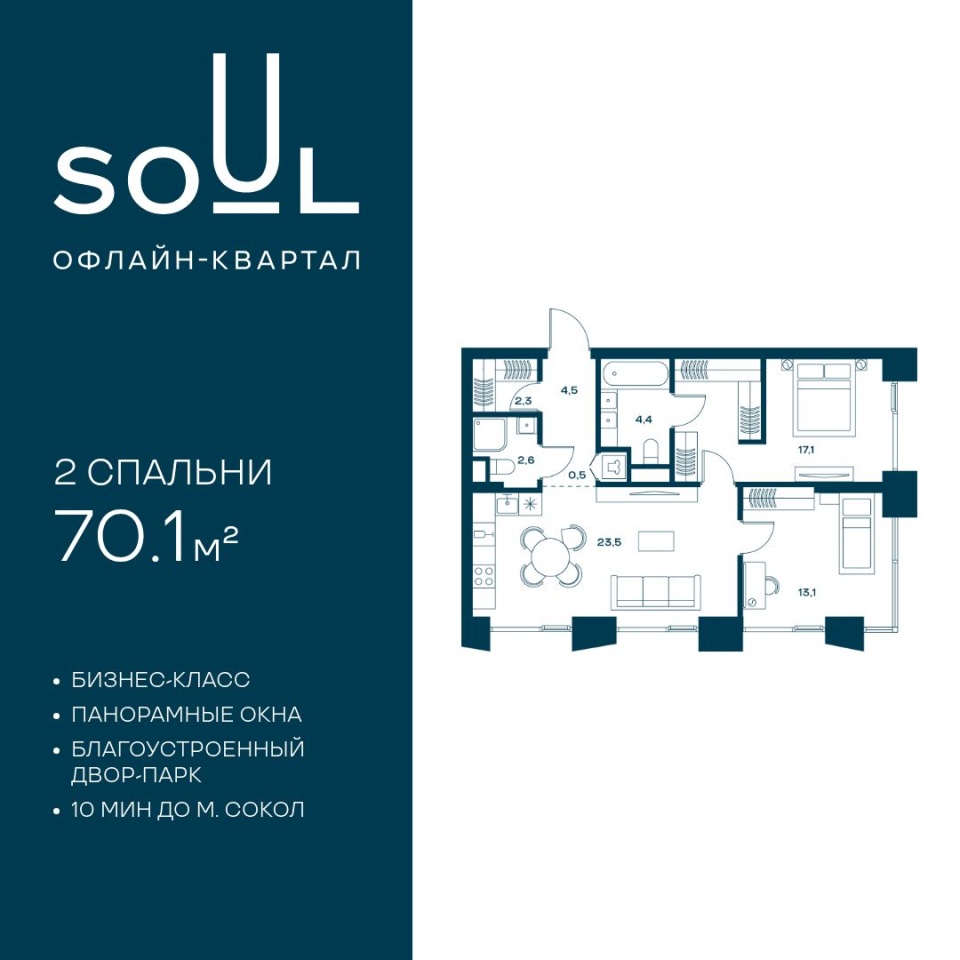 Цены указаны с условием 100% оплаты и стандартной ипотеки. Прямая продажа от застройщика. Продается 2-к. квартира номер 223 общей площадью 70.1 кв.м. на 3-м этаже 27 этажного дома, Корпус 4. С отделкой White Box Max. Проект бизнес-класса SOUL от девелопера FORMA. До метро Сокол 10 мин пешком. Архитектура от британского бюро SimpsonHaugh. Благоустройство дворов — Gillespies и GAFA. Территория состоит из культурного парка и приватных дворов. Озеленение в эстетике лесного оазиса. Насыщенное благоустройство: прогулочные тропинки, релакс-зоны, пряный и сенсорный сады, развивающие детские площадки и воркауты. В центре проекта объект культурного наследия — общественное пространство Изофабрика, построенная в 30-х годах по проекту архитектора Георгия Гольца. Здесь будут располагаться мастерские для взрослых и детей, выставочные залы, коворкинги, образовательный центр, рестораны и кафе. Квартиры с панорамными окнами, мастер-спальнями, гардеробными, классическими балконами и лоджиями, видовыми террасами. Высота потолков от 2,9 до 3,5 м. В проекте 2 детских сада на 100 и 200 малышей. Клубная гостиная, фитнес-рум, детская игровая комната, дизайнерские лобби, подземный паркинг и келлеры.