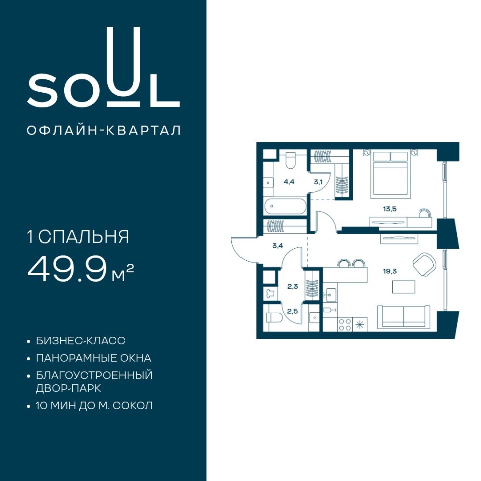 Цены указаны с условием 100% оплаты и стандартной ипотеки. Прямая продажа от застройщика. Продается 1-к. квартира номер 352 общей площадью 49.9 кв.м. на 14-м этаже 27 этажного дома, Корпус 4. С отделкой White Box Max. Проект бизнес-класса SOUL от девелопера FORMA. До метро Сокол 10 мин пешком. Архитектура от британского бюро SimpsonHaugh. Благоустройство дворов — Gillespies и GAFA. Территория состоит из культурного парка и приватных дворов. Озеленение в эстетике лесного оазиса. Насыщенное благоустройство: прогулочные тропинки, релакс-зоны, пряный и сенсорный сады, развивающие детские площадки и воркауты. В центре проекта объект культурного наследия — общественное пространство Изофабрика, построенная в 30-х годах по проекту архитектора Георгия Гольца. Здесь будут располагаться мастерские для взрослых и детей, выставочные залы, коворкинги, образовательный центр, рестораны и кафе. Квартиры с панорамными окнами, мастер-спальнями, гардеробными, классическими балконами и лоджиями, видовыми террасами. Высота потолков от 2,9 до 3,5 м. В проекте 2 детских сада на 100 и 200 малышей. Клубная гостиная, фитнес-рум, детская игровая комната, дизайнерские лобби, подземный паркинг и келлеры.