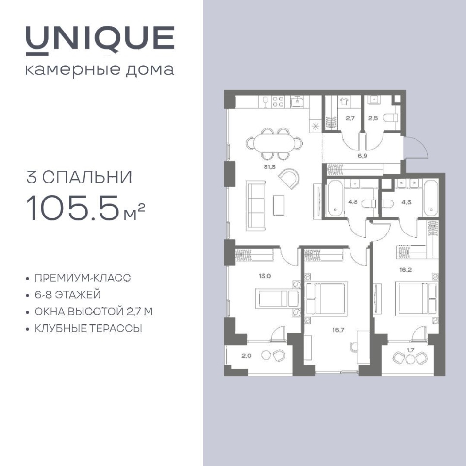 Цены указаны с условием 100% оплаты и стандартной ипотеки. Прямая продажа от застройщика. Продается 3-к. квартира номер 839 общей площадью 105.5 кв.м. на 2-м этаже 8 этажного дома, корпус UNIQUE (премиум-класс). Без отделки. Проект бизнес-класса SOUL от девелопера FORMA. До метро Сокол 10 мин пешком. Архитектура от британского бюро SimpsonHaugh. Благоустройство дворов — Gillespies и GAFA. Территория состоит из культурного парка и приватных дворов. Озеленение в эстетике лесного оазиса. Насыщенное благоустройство: прогулочные тропинки, релакс-зоны, пряный и сенсорный сады, развивающие детские площадки и воркауты. В центре проекта объект культурного наследия — общественное пространство Изофабрика, построенная в 30-х годах по проекту архитектора Георгия Гольца. Здесь будут располагаться мастерские для взрослых и детей, выставочные залы, коворкинги, образовательный центр, рестораны и кафе. Квартиры с панорамными окнами, мастер-спальнями, гардеробными, классическими балконами и лоджиями, видовыми террасами. Высота потолков от 2,9 до 3,5 м. В проекте 2 детских сада на 100 и 200 малышей. Клубная гостиная, фитнес-рум, детская игровая комната, дизайнерские лобби, подземный паркинг и келлеры.