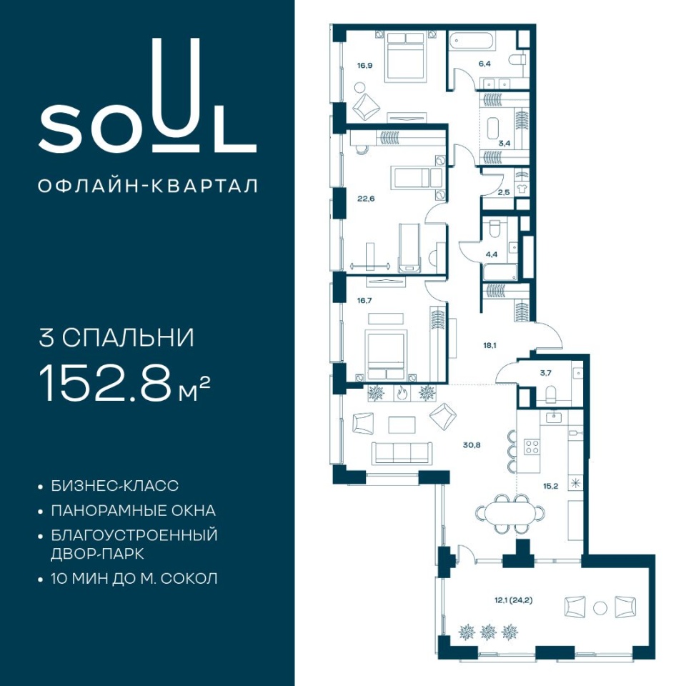 Цены указаны с условием 100% оплаты и стандартной ипотеки. Прямая продажа от застройщика. Продается 3-к. квартира номер 204 общей площадью 152.8 кв.м. на 25-м этаже 25 этажного дома, Корпус 3. С отделкой White Box Max. Проект бизнес-класса SOUL от девелопера FORMA. До метро Сокол 10 мин пешком. Архитектура от британского бюро SimpsonHaugh. Благоустройство дворов — Gillespies и GAFA. Территория состоит из культурного парка и приватных дворов. Озеленение в эстетике лесного оазиса. Насыщенное благоустройство: прогулочные тропинки, релакс-зоны, пряный и сенсорный сады, развивающие детские площадки и воркауты. В центре проекта объект культурного наследия — общественное пространство Изофабрика, построенная в 30-х годах по проекту архитектора Георгия Гольца. Здесь будут располагаться мастерские для взрослых и детей, выставочные залы, коворкинги, образовательный центр, рестораны и кафе. Квартиры с панорамными окнами, мастер-спальнями, гардеробными, классическими балконами и лоджиями, видовыми террасами. Высота потолков от 2,9 до 3,5 м. В проекте 2 детских сада на 100 и 200 малышей. Клубная гостиная, фитнес-рум, детская игровая комната, дизайнерские лобби, подземный паркинг и келлеры.