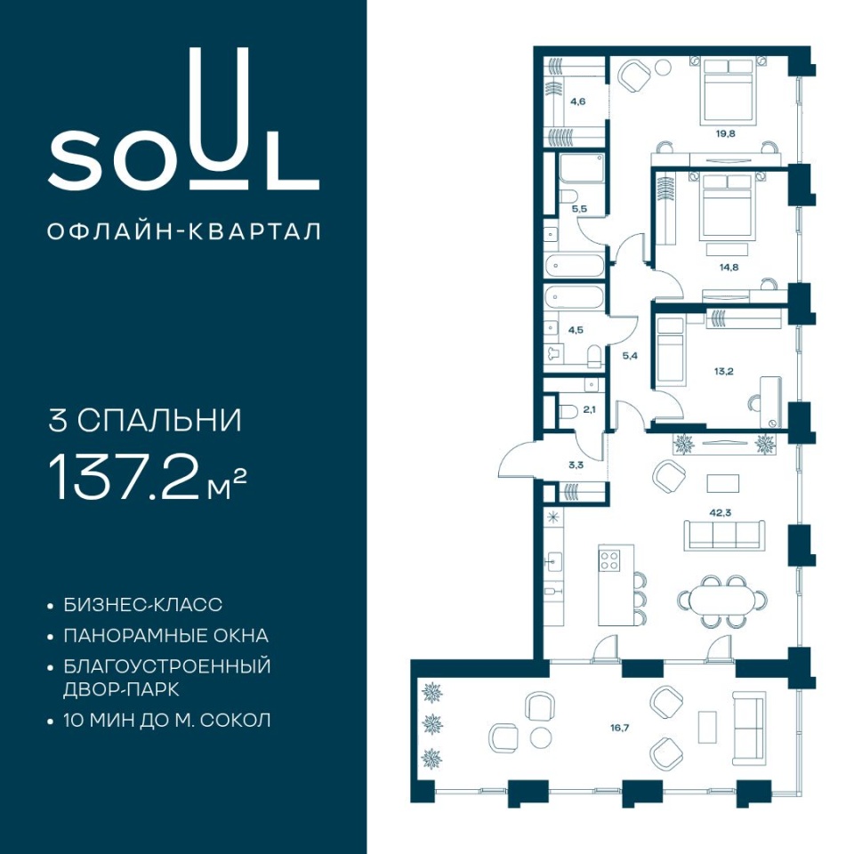 Цены указаны с условием 100% оплаты и стандартной ипотеки. Прямая продажа от застройщика. Продается 3-к. квартира номер 471 общей площадью 137.2 кв.м. на 27-м этаже 27 этажного дома, Корпус 4. С отделкой White Box Max. Проект бизнес-класса SOUL от девелопера FORMA. До метро Сокол 10 мин пешком. Архитектура от британского бюро SimpsonHaugh. Благоустройство дворов — Gillespies и GAFA. Территория состоит из культурного парка и приватных дворов. Озеленение в эстетике лесного оазиса. Насыщенное благоустройство: прогулочные тропинки, релакс-зоны, пряный и сенсорный сады, развивающие детские площадки и воркауты. В центре проекта объект культурного наследия — общественное пространство Изофабрика, построенная в 30-х годах по проекту архитектора Георгия Гольца. Здесь будут располагаться мастерские для взрослых и детей, выставочные залы, коворкинги, образовательный центр, рестораны и кафе. Квартиры с панорамными окнами, мастер-спальнями, гардеробными, классическими балконами и лоджиями, видовыми террасами. Высота потолков от 2,9 до 3,5 м. В проекте 2 детских сада на 100 и 200 малышей. Клубная гостиная, фитнес-рум, детская игровая комната, дизайнерские лобби, подземный паркинг и келлеры.