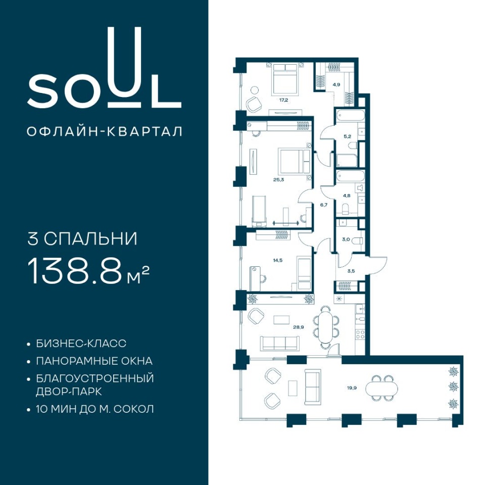 Цены указаны с условием 100% оплаты и стандартной ипотеки. Прямая продажа от застройщика. Продается 3-к. квартира номер 472 общей площадью 138.8 кв.м. на 27-м этаже 27 этажного дома, Корпус 4. С отделкой White Box Max. Проект бизнес-класса SOUL от девелопера FORMA. До метро Сокол 10 мин пешком. Архитектура от британского бюро SimpsonHaugh. Благоустройство дворов — Gillespies и GAFA. Территория состоит из культурного парка и приватных дворов. Озеленение в эстетике лесного оазиса. Насыщенное благоустройство: прогулочные тропинки, релакс-зоны, пряный и сенсорный сады, развивающие детские площадки и воркауты. В центре проекта объект культурного наследия — общественное пространство Изофабрика, построенная в 30-х годах по проекту архитектора Георгия Гольца. Здесь будут располагаться мастерские для взрослых и детей, выставочные залы, коворкинги, образовательный центр, рестораны и кафе. Квартиры с панорамными окнами, мастер-спальнями, гардеробными, классическими балконами и лоджиями, видовыми террасами. Высота потолков от 2,9 до 3,5 м. В проекте 2 детских сада на 100 и 200 малышей. Клубная гостиная, фитнес-рум, детская игровая комната, дизайнерские лобби, подземный паркинг и келлеры.