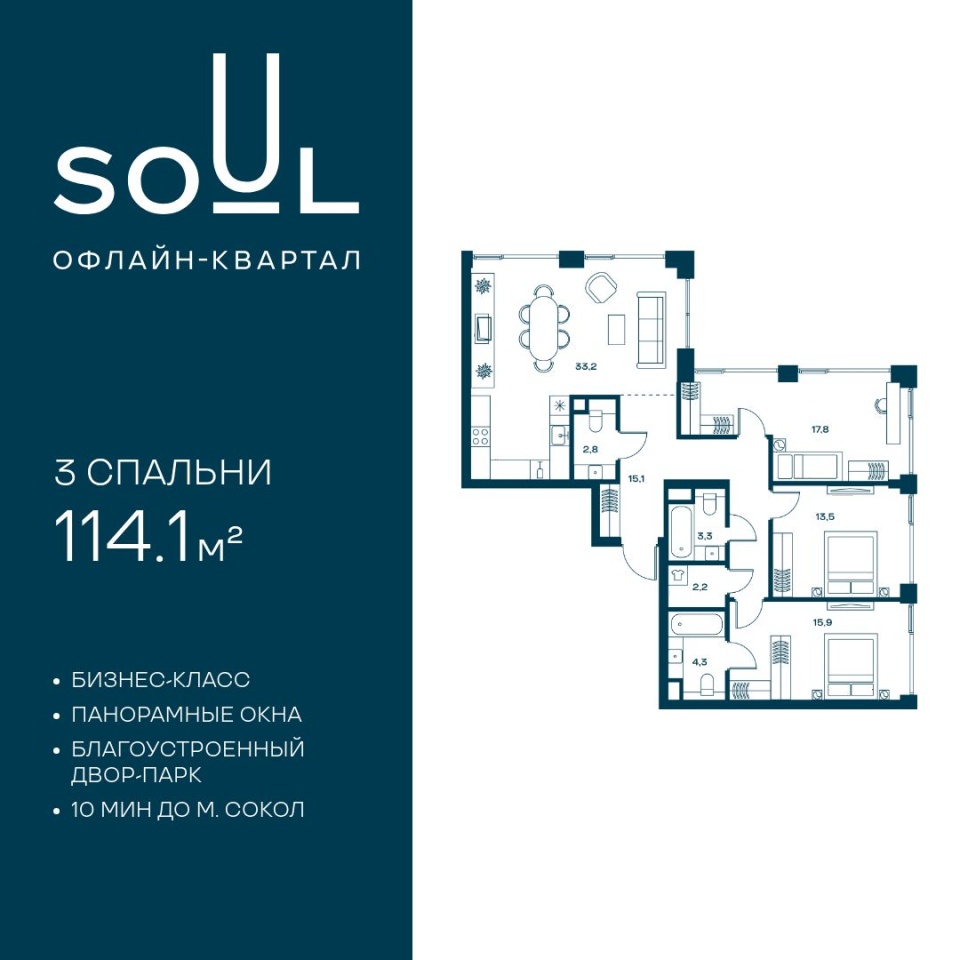 Цены указаны с условием 100% оплаты и стандартной ипотеки. Прямая продажа от застройщика. Продается 3-к. квартира номер 715 общей площадью 114.1 кв.м. на 29-м этаже 29 этажного дома, Корпус 5. Без отделки. Проект бизнес-класса SOUL от девелопера FORMA. До метро Сокол 10 мин пешком. Архитектура от британского бюро SimpsonHaugh. Благоустройство дворов — Gillespies и GAFA. Территория состоит из культурного парка и приватных дворов. Озеленение в эстетике лесного оазиса. Насыщенное благоустройство: прогулочные тропинки, релакс-зоны, пряный и сенсорный сады, развивающие детские площадки и воркауты. В центре проекта объект культурного наследия — общественное пространство Изофабрика, построенная в 30-х годах по проекту архитектора Георгия Гольца. Здесь будут располагаться мастерские для взрослых и детей, выставочные залы, коворкинги, образовательный центр, рестораны и кафе. Квартиры с панорамными окнами, мастер-спальнями, гардеробными, классическими балконами и лоджиями, видовыми террасами. Высота потолков от 2,9 до 3,5 м. В проекте 2 детских сада на 100 и 200 малышей. Клубная гостиная, фитнес-рум, детская игровая комната, дизайнерские лобби, подземный паркинг и келлеры.