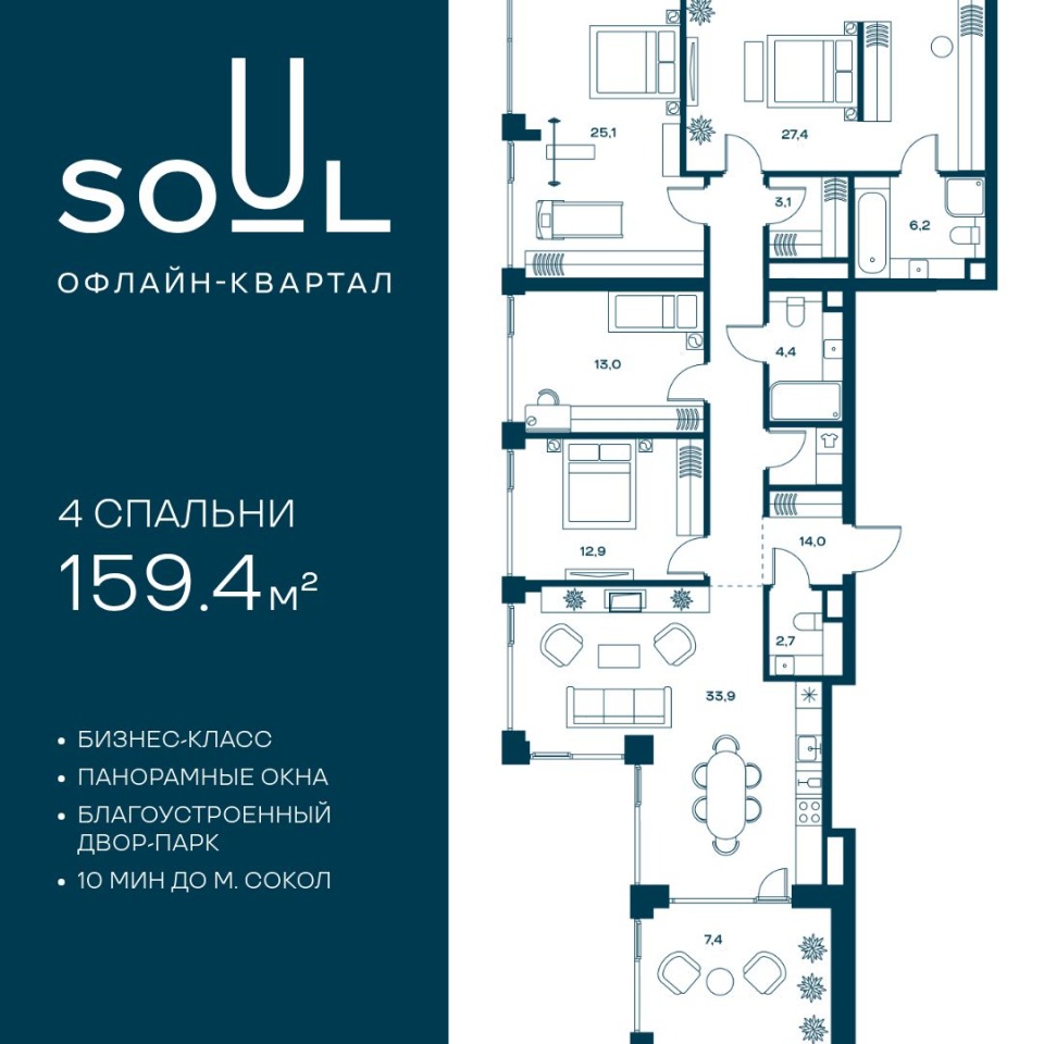 Цены указаны с условием 100% оплаты и стандартной ипотеки. Прямая продажа от застройщика. Продается 4-к. квартира номер 717 общей площадью 159.4 кв.м. на 29-м этаже 29 этажного дома, Корпус 5. Без отделки. Проект бизнес-класса SOUL от девелопера FORMA. До метро Сокол 10 мин пешком. Архитектура от британского бюро SimpsonHaugh. Благоустройство дворов — Gillespies и GAFA. Территория состоит из культурного парка и приватных дворов. Озеленение в эстетике лесного оазиса. Насыщенное благоустройство: прогулочные тропинки, релакс-зоны, пряный и сенсорный сады, развивающие детские площадки и воркауты. В центре проекта объект культурного наследия — общественное пространство Изофабрика, построенная в 30-х годах по проекту архитектора Георгия Гольца. Здесь будут располагаться мастерские для взрослых и детей, выставочные залы, коворкинги, образовательный центр, рестораны и кафе. Квартиры с панорамными окнами, мастер-спальнями, гардеробными, классическими балконами и лоджиями, видовыми террасами. Высота потолков от 2,9 до 3,5 м. В проекте 2 детских сада на 100 и 200 малышей. Клубная гостиная, фитнес-рум, детская игровая комната, дизайнерские лобби, подземный паркинг и келлеры.