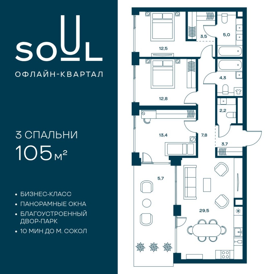 Цены указаны с условием 100% оплаты и стандартной ипотеки. Прямая продажа от застройщика. Продается 3-к. квартира номер 692 общей площадью 105 кв.м. на 24-м этаже 29 этажного дома, Корпус 5. Без отделки. Проект бизнес-класса SOUL от девелопера FORMA. До метро Сокол 10 мин пешком. Архитектура от британского бюро SimpsonHaugh. Благоустройство дворов — Gillespies и GAFA. Территория состоит из культурного парка и приватных дворов. Озеленение в эстетике лесного оазиса. Насыщенное благоустройство: прогулочные тропинки, релакс-зоны, пряный и сенсорный сады, развивающие детские площадки и воркауты. В центре проекта объект культурного наследия — общественное пространство Изофабрика, построенная в 30-х годах по проекту архитектора Георгия Гольца. Здесь будут располагаться мастерские для взрослых и детей, выставочные залы, коворкинги, образовательный центр, рестораны и кафе. Квартиры с панорамными окнами, мастер-спальнями, гардеробными, классическими балконами и лоджиями, видовыми террасами. Высота потолков от 2,9 до 3,5 м. В проекте 2 детских сада на 100 и 200 малышей. Клубная гостиная, фитнес-рум, детская игровая комната, дизайнерские лобби, подземный паркинг и келлеры.