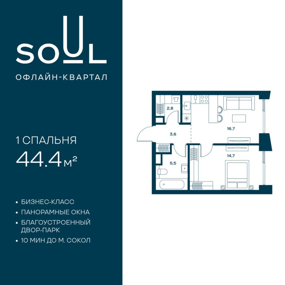 Цены указаны с условием 100% оплаты и стандартной ипотеки. Прямая продажа от застройщика. Продается 1-к. квартира номер 222 общей площадью 44.4 кв.м. на 3-м этаже 27 этажного дома, Корпус 4. С отделкой White Box Max. Проект бизнес-класса SOUL от девелопера FORMA. До метро Сокол 10 мин пешком. Архитектура от британского бюро SimpsonHaugh. Благоустройство дворов — Gillespies и GAFA. Территория состоит из культурного парка и приватных дворов. Озеленение в эстетике лесного оазиса. Насыщенное благоустройство: прогулочные тропинки, релакс-зоны, пряный и сенсорный сады, развивающие детские площадки и воркауты. В центре проекта объект культурного наследия — общественное пространство Изофабрика, построенная в 30-х годах по проекту архитектора Георгия Гольца. Здесь будут располагаться мастерские для взрослых и детей, выставочные залы, коворкинги, образовательный центр, рестораны и кафе. Квартиры с панорамными окнами, мастер-спальнями, гардеробными, классическими балконами и лоджиями, видовыми террасами. Высота потолков от 2,9 до 3,5 м. В проекте 2 детских сада на 100 и 200 малышей. Клубная гостиная, фитнес-рум, детская игровая комната, дизайнерские лобби, подземный паркинг и келлеры.