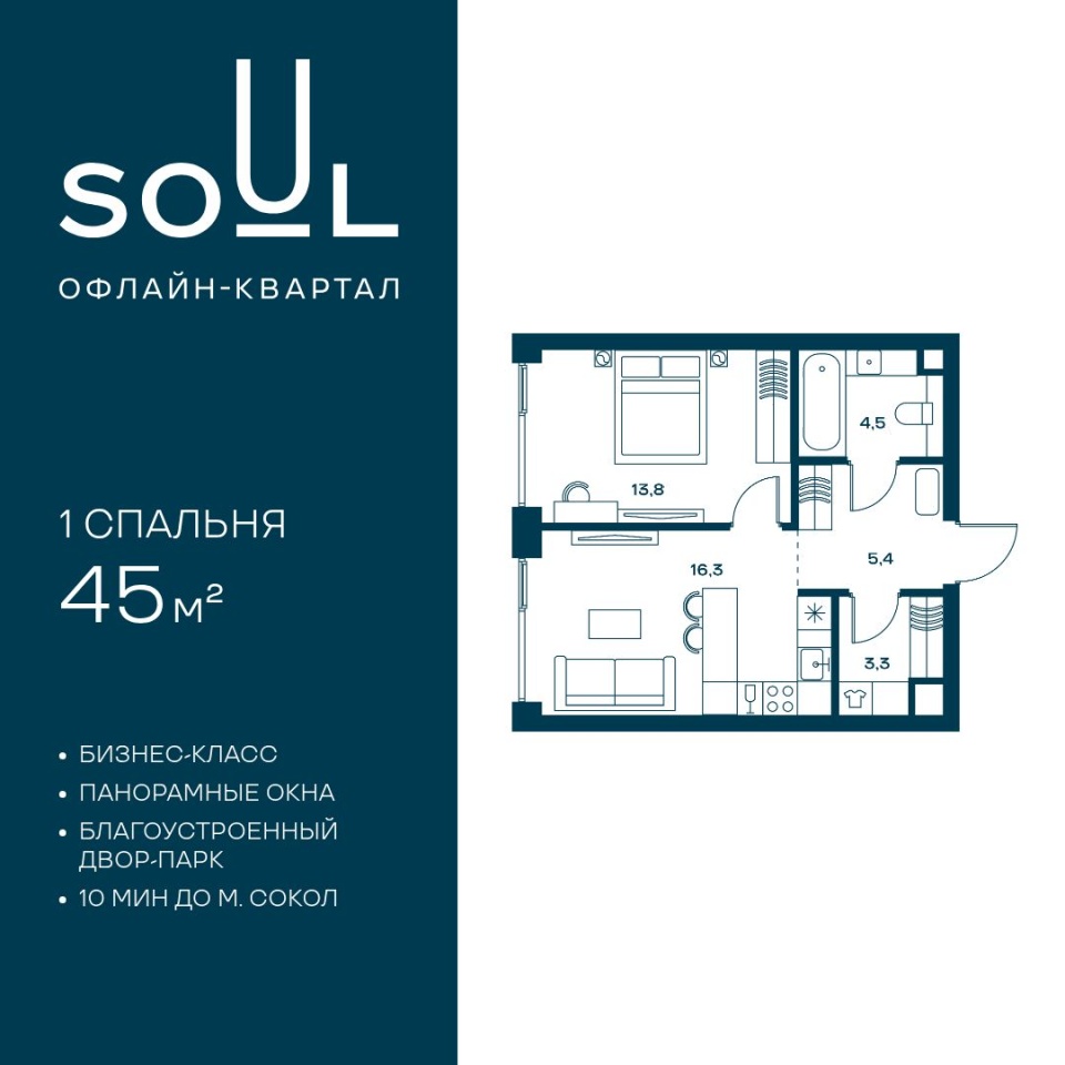 Цены указаны с условием 100% оплаты и стандартной ипотеки. Прямая продажа от застройщика. Продается 1-к. квартира номер 685 общей площадью 45 кв.м. на 23-м этаже 29 этажного дома, Корпус 5. Без отделки. Проект бизнес-класса SOUL от девелопера FORMA. До метро Сокол 10 мин пешком. Архитектура от британского бюро SimpsonHaugh. Благоустройство дворов — Gillespies и GAFA. Территория состоит из культурного парка и приватных дворов. Озеленение в эстетике лесного оазиса. Насыщенное благоустройство: прогулочные тропинки, релакс-зоны, пряный и сенсорный сады, развивающие детские площадки и воркауты. В центре проекта объект культурного наследия — общественное пространство Изофабрика, построенная в 30-х годах по проекту архитектора Георгия Гольца. Здесь будут располагаться мастерские для взрослых и детей, выставочные залы, коворкинги, образовательный центр, рестораны и кафе. Квартиры с панорамными окнами, мастер-спальнями, гардеробными, классическими балконами и лоджиями, видовыми террасами. Высота потолков от 2,9 до 3,5 м. В проекте 2 детских сада на 100 и 200 малышей. Клубная гостиная, фитнес-рум, детская игровая комната, дизайнерские лобби, подземный паркинг и келлеры.