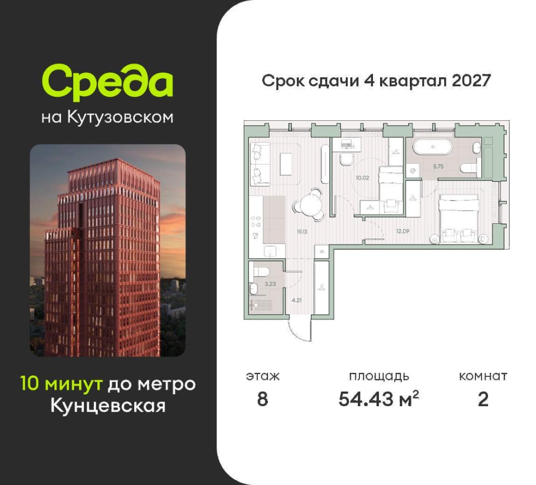 Квартира располагается на 8 этаже 12-этажного дома в ЖК Среда на Кутузовском.