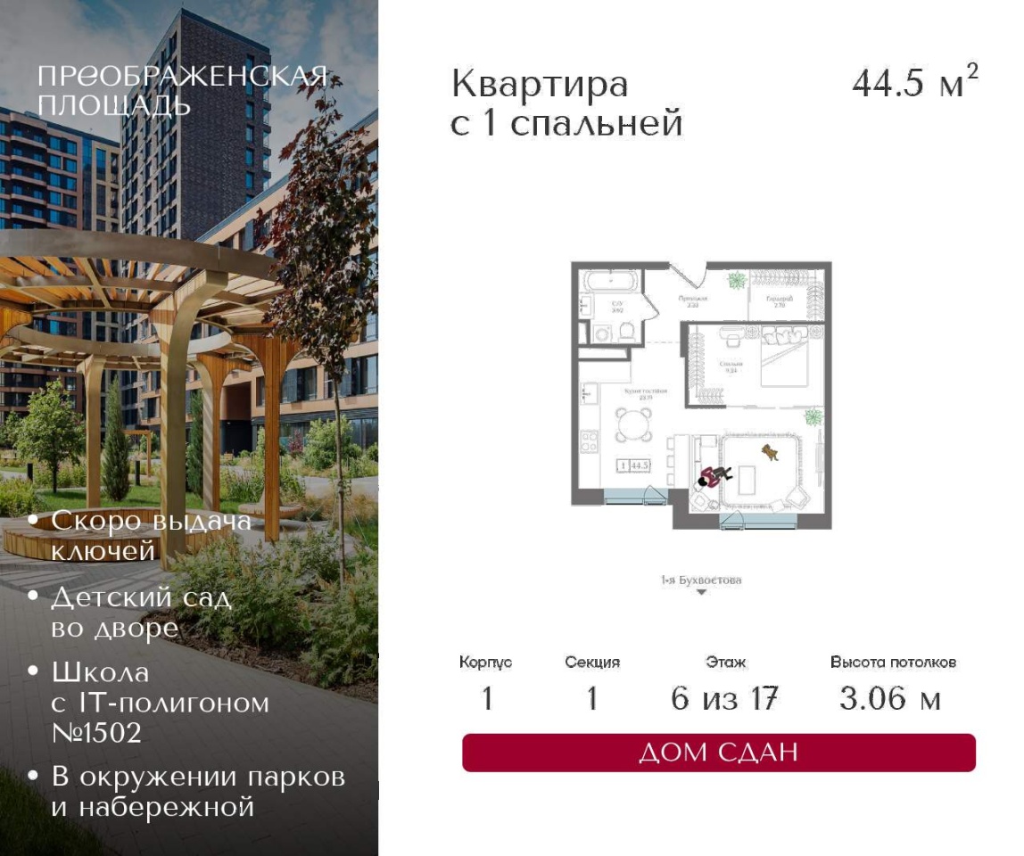 | Этаж | 6 из 17 | Жилая площадь | 39.5 м2 |