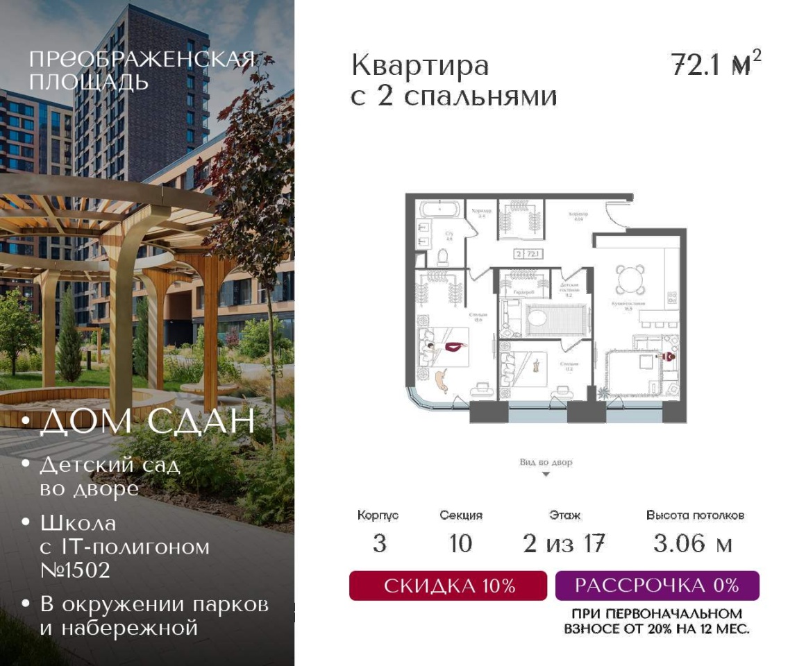 | Этаж | 2 из 17 | Жилая площадь | 67.1 м2 |