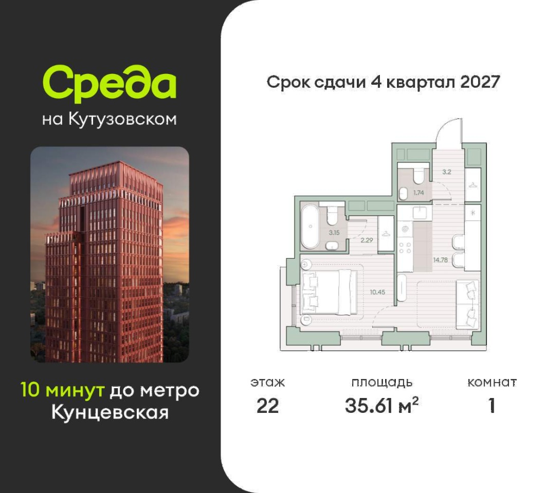 Квартира располагается на 22 этаже 30-этажного дома в ЖК Среда на Кутузовском.