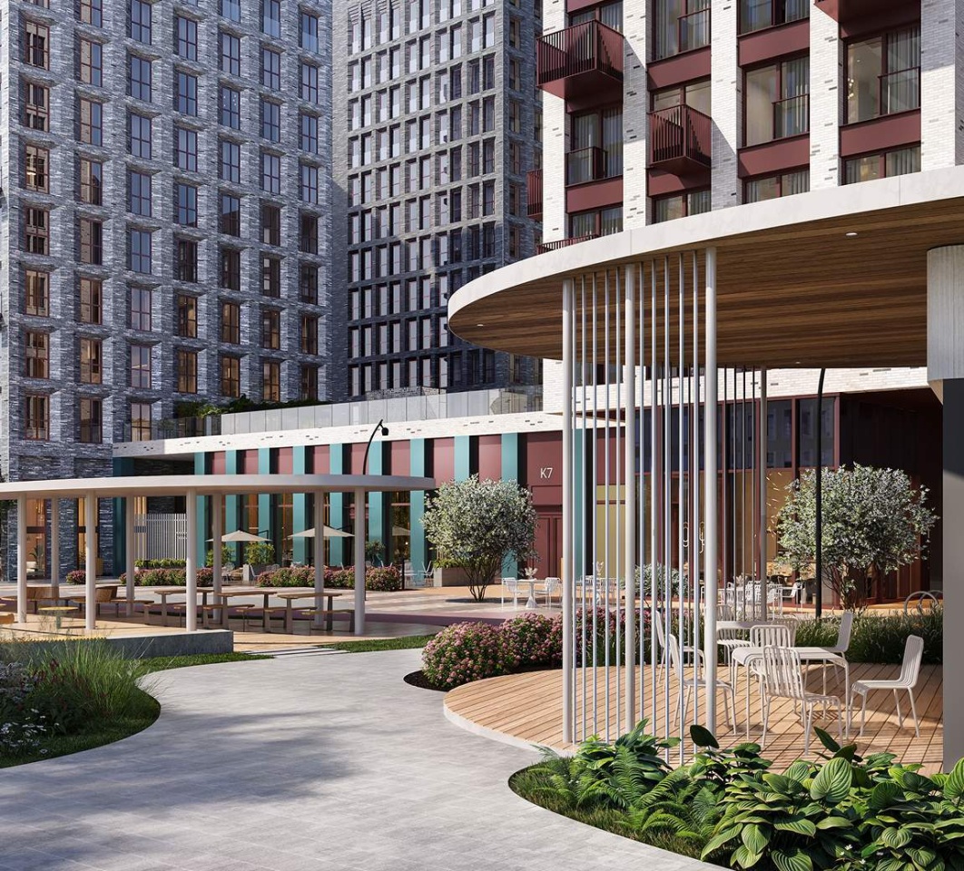 Особое внимание в проекте уделяется созданию функциональных пространств не только внутри дома, но и за его пределами. В ландшафтном парке «Среды на Лобачевского» расположены крытые зоны для спокойного времяпровождения, места для активного отдыха и спорта, коворкинг, соседский комьюнити-центр, водные объекты.