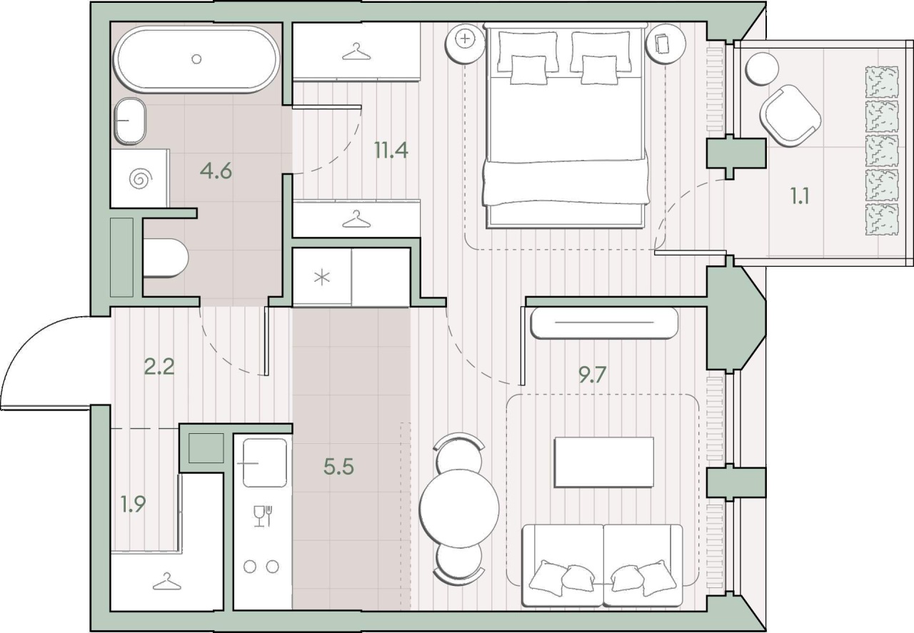 Жилая площадь 21.1 м2, кухня 5.5 м2, предчистовая отделка, комнаты изолированные.