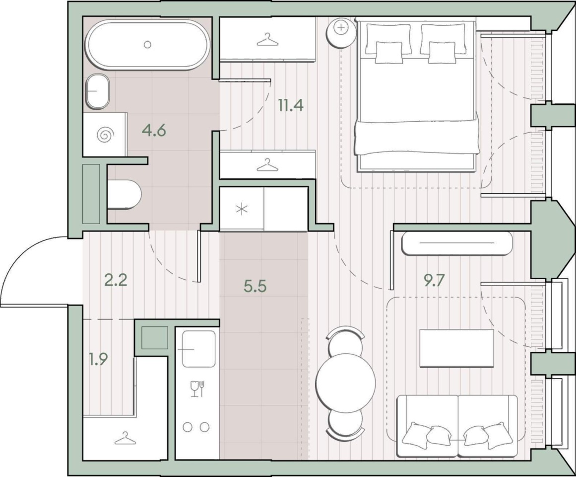 Жилая площадь 21.1 м2, кухня 5.5 м2, предчистовая отделка, комнаты изолированные.