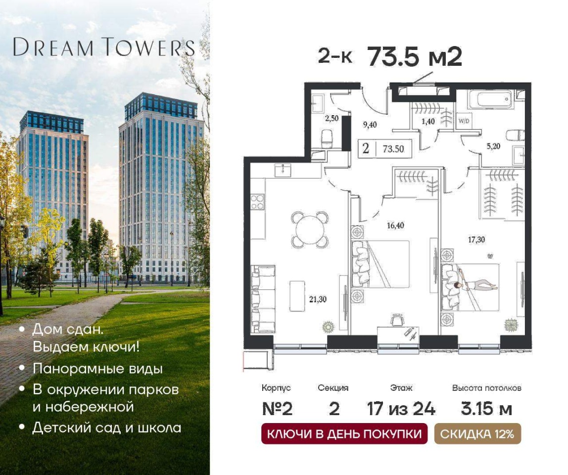 Комнат | 2 | Этаж | 17 из 24 |