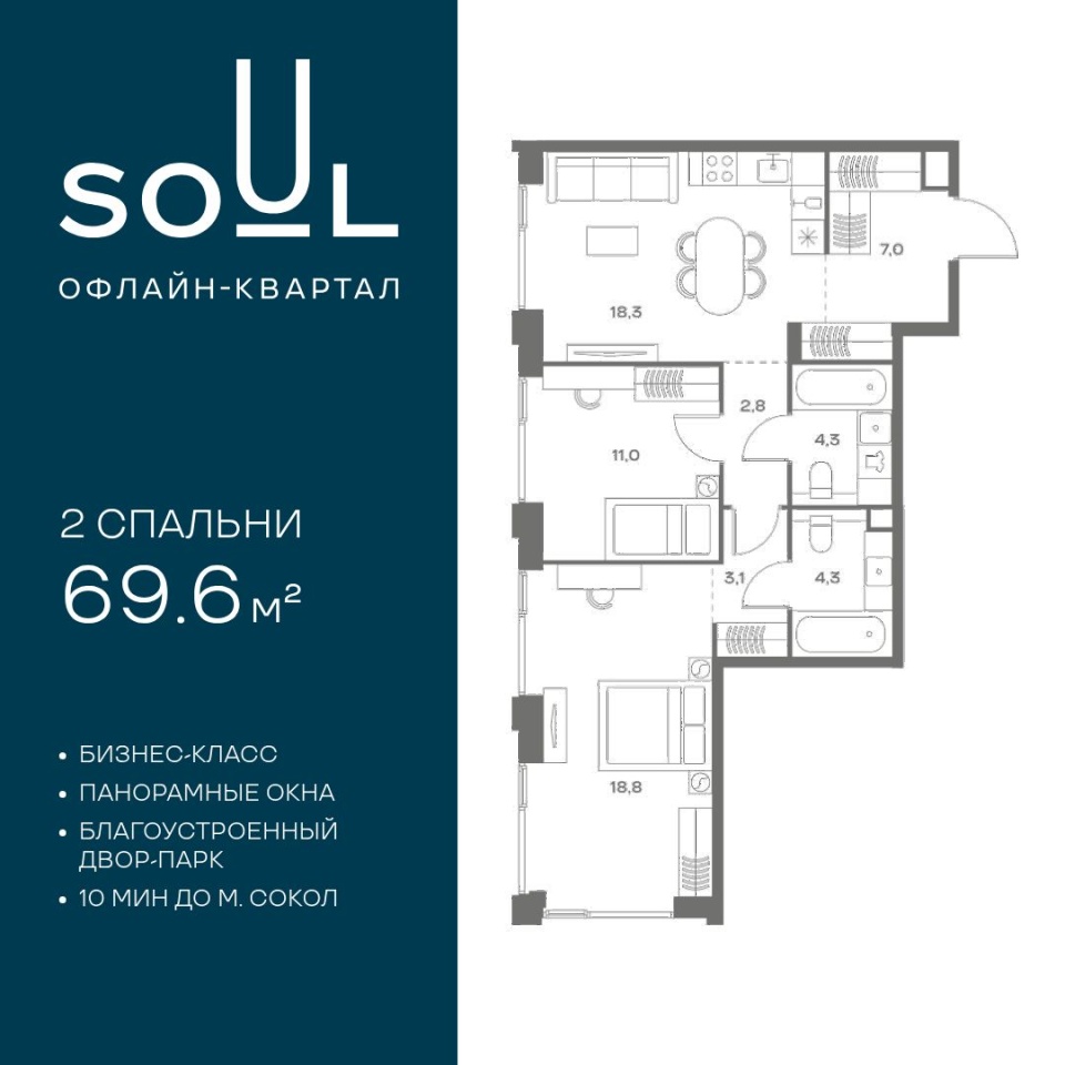 Цены указаны с условием 100% оплаты и стандартной ипотеки. Прямая продажа от застройщика. Продается 2-к. квартира номер 674 общей площадью 69.6 кв.м. на 9-м этаже 24 этажного дома, Корпус 9. С отделкой White Box Max. Проект бизнес-класса SOUL от девелопера FORMA. До метро Сокол 10 мин пешком. Архитектура от британского бюро SimpsonHaugh. Благоустройство дворов — Gillespies и GAFA. Территория состоит из культурного парка и приватных дворов. Озеленение в эстетике лесного оазиса. Насыщенное благоустройство: прогулочные тропинки, релакс-зоны, пряный и сенсорный сады, развивающие детские площадки и воркауты. В центре проекта объект культурного наследия — общественное пространство Изофабрика, построенная в 30-х годах по проекту архитектора Георгия Гольца. Здесь будут располагаться мастерские для взрослых и детей, выставочные залы, коворкинги, образовательный центр, рестораны и кафе. Квартиры с панорамными окнами, мастер-спальнями, гардеробными, классическими балконами и лоджиями, видовыми террасами. Высота потолков от 2,9 до 3,5 м. В проекте 2 детских сада на 100 и 200 малышей. Клубная гостиная, фитнес-рум, детская игровая комната, дизайнерские лобби, подземный паркинг и келлеры.