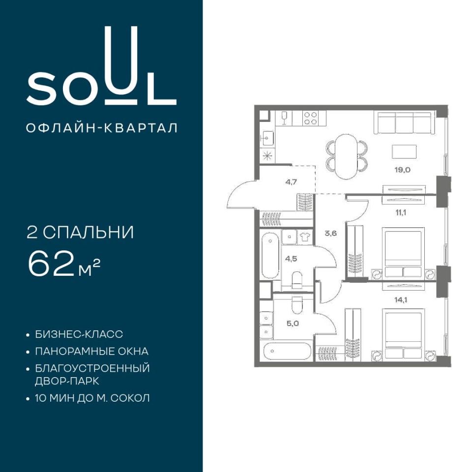 Цены указаны с условием 100% оплаты и стандартной ипотеки. Прямая продажа от застройщика. Продается 2-к. квартира номер 840 общей площадью 62 кв.м. на 22-м этаже 24 этажного дома, Корпус 9. С отделкой White Box Max. Проект бизнес-класса SOUL от девелопера FORMA. До метро Сокол 10 мин пешком. Архитектура от британского бюро SimpsonHaugh. Благоустройство дворов — Gillespies и GAFA. Территория состоит из культурного парка и приватных дворов. Озеленение в эстетике лесного оазиса. Насыщенное благоустройство: прогулочные тропинки, релакс-зоны, пряный и сенсорный сады, развивающие детские площадки и воркауты. В центре проекта объект культурного наследия — общественное пространство Изофабрика, построенная в 30-х годах по проекту архитектора Георгия Гольца. Здесь будут располагаться мастерские для взрослых и детей, выставочные залы, коворкинги, образовательный центр, рестораны и кафе. Квартиры с панорамными окнами, мастер-спальнями, гардеробными, классическими балконами и лоджиями, видовыми террасами. Высота потолков от 2,9 до 3,5 м. В проекте 2 детских сада на 100 и 200 малышей. Клубная гостиная, фитнес-рум, детская игровая комната, дизайнерские лобби, подземный паркинг и келлеры.