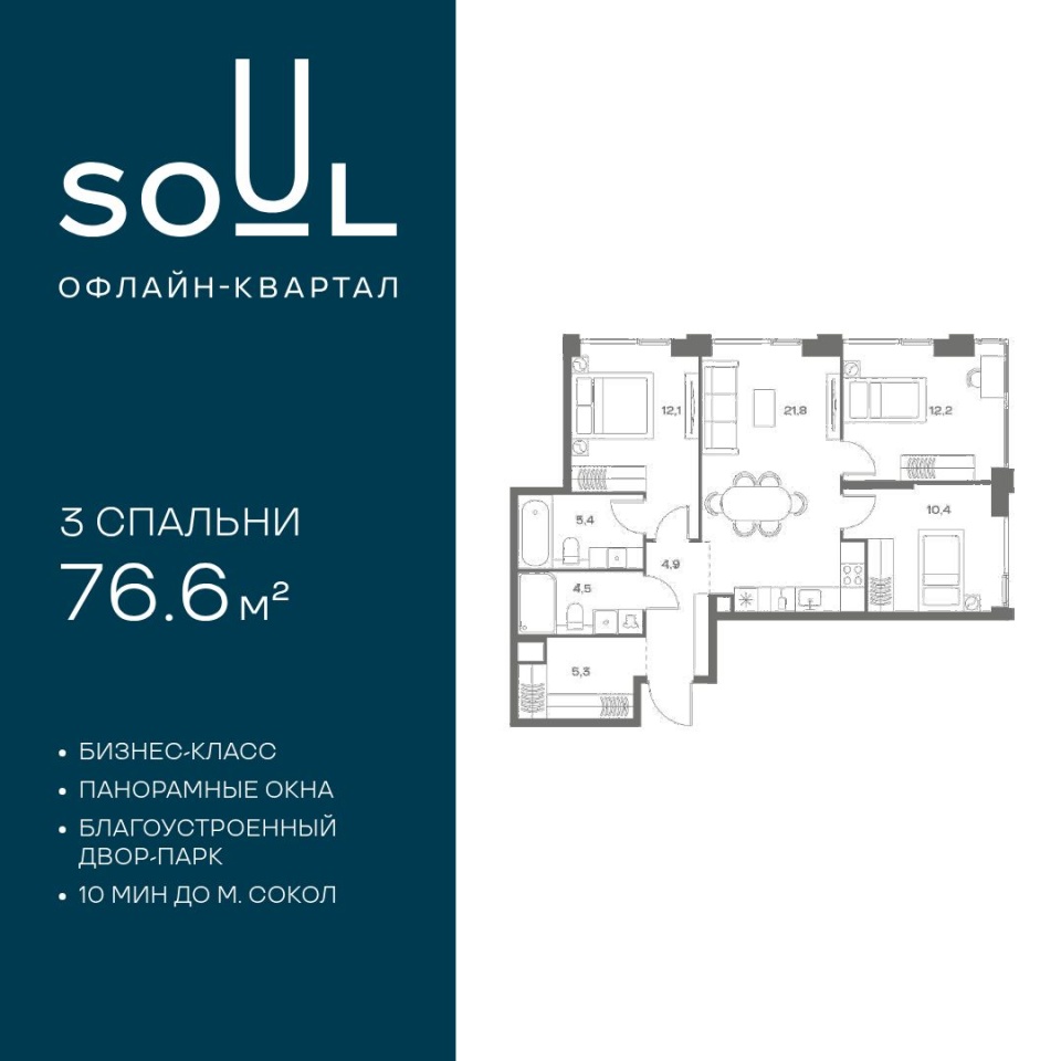 Цены указаны с условием 100% оплаты и стандартной ипотеки. Прямая продажа от застройщика. Продается 3-к. квартира номер 620 общей площадью 76.6 кв.м. на 6-м этаже 24 этажного дома, Корпус 9. С отделкой White Box Max. Проект бизнес-класса SOUL от девелопера FORMA. До метро Сокол 10 мин пешком. Архитектура от британского бюро SimpsonHaugh. Благоустройство дворов — Gillespies и GAFA. Территория состоит из культурного парка и приватных дворов. Озеленение в эстетике лесного оазиса. Насыщенное благоустройство: прогулочные тропинки, релакс-зоны, пряный и сенсорный сады, развивающие детские площадки и воркауты. В центре проекта объект культурного наследия — общественное пространство Изофабрика, построенная в 30-х годах по проекту архитектора Георгия Гольца. Здесь будут располагаться мастерские для взрослых и детей, выставочные залы, коворкинги, образовательный центр, рестораны и кафе. Квартиры с панорамными окнами, мастер-спальнями, гардеробными, классическими балконами и лоджиями, видовыми террасами. Высота потолков от 2,9 до 3,5 м. В проекте 2 детских сада на 100 и 200 малышей. Клубная гостиная, фитнес-рум, детская игровая комната, дизайнерские лобби, подземный паркинг и келлеры.