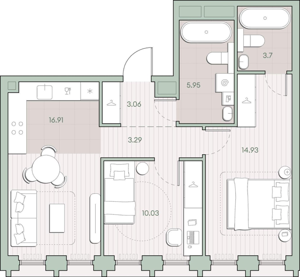 Жилая площадь 24.96 м2, кухня 16.91 м2, предчистовая отделка, комнаты изолированные.