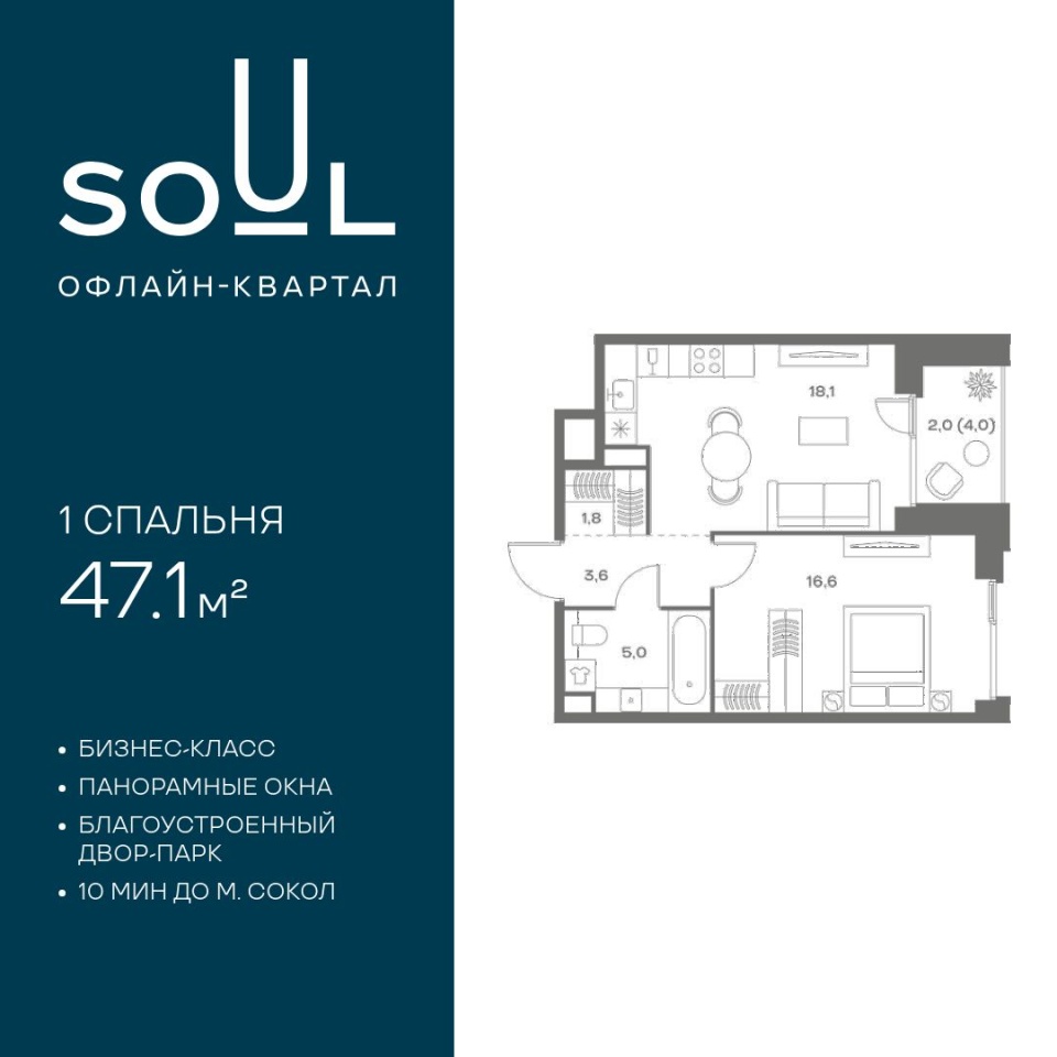 Цены указаны с условием 100% оплаты и стандартной ипотеки. Прямая продажа от застройщика. Продается 1-к. квартира номер 155 общей площадью 47.1 кв.м. на 3-м этаже 9 этажного дома, корпус UNIQUE (премиум-класс). Без отделки. Проект бизнес-класса SOUL от девелопера FORMA. До метро Сокол 10 мин пешком. Архитектура от британского бюро SimpsonHaugh. Благоустройство дворов — Gillespies и GAFA. Территория состоит из культурного парка и приватных дворов. Озеленение в эстетике лесного оазиса. Насыщенное благоустройство: прогулочные тропинки, релакс-зоны, пряный и сенсорный сады, развивающие детские площадки и воркауты. В центре проекта объект культурного наследия — общественное пространство Изофабрика, построенная в 30-х годах по проекту архитектора Георгия Гольца. Здесь будут располагаться мастерские для взрослых и детей, выставочные залы, коворкинги, образовательный центр, рестораны и кафе. Квартиры с панорамными окнами, мастер-спальнями, гардеробными, классическими балконами и лоджиями, видовыми террасами. Высота потолков от 2,9 до 3,5 м. В проекте 2 детских сада на 100 и 200 малышей. Клубная гостиная, фитнес-рум, детская игровая комната, дизайнерские лобби, подземный паркинг и келлеры.