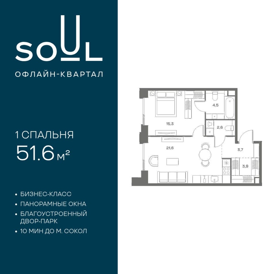 Цены указаны с условием 100% оплаты и стандартной ипотеки. Прямая продажа от застройщика. Продается 1-к. квартира квартира номер 16 общей площадью 51.6 кв.м. на 3-м этаже 9 этажного дома, Корпус 7. Без отделки. Проект бизнес-класса SOUL от девелопера FORMA. До метро Сокол 10 мин пешком. Архитектура от британского бюро SimpsonHaugh. Благоустройство дворов — Gillespies и GAFA. Территория состоит из культурного парка и приватных дворов. Озеленение в эстетике лесного оазиса. Насыщенное благоустройство: прогулочные тропинки, релакс-зоны, пряный и сенсорный сады, развивающие детские площадки и воркауты. В центре проекта объект культурного наследия — общественное пространство Изофабрика, построенная в 30-х годах по проекту архитектора Георгия Гольца. Здесь будут располагаться мастерские для взрослых и детей, выставочные залы, коворкинги, образовательный центр, рестораны и кафе. Квартиры с панорамными окнами, мастер-спальнями, гардеробными, классическими балконами и лоджиями, видовыми террасами. Высота потолков от 2,9 до 3,5 м. В проекте 2 детских сада на 100 и 200 малышей. Клубная гостиная, фитнес-рум, детская игровая комната, дизайнерские лобби, подземный паркинг и келлеры.