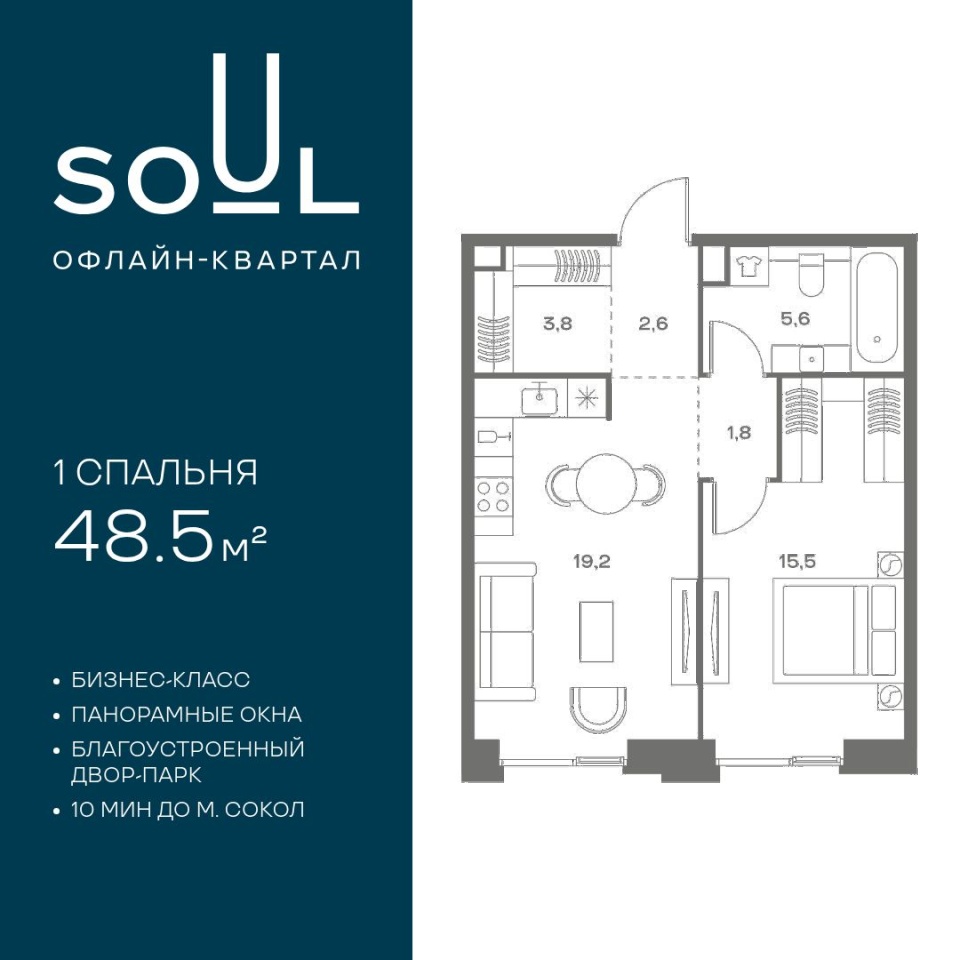 Цены указаны с условием 100% оплаты и стандартной ипотеки. Прямая продажа от застройщика. Продается 1-к. квартира номер 96 общей площадью 48.5 кв.м. на 3-м этаже 8 этажного дома, корпус UNIQUE (премиум-класс). Без отделки. Проект бизнес-класса SOUL от девелопера FORMA. До метро Сокол 10 мин пешком. Архитектура от британского бюро SimpsonHaugh. Благоустройство дворов — Gillespies и GAFA. Территория состоит из культурного парка и приватных дворов. Озеленение в эстетике лесного оазиса. Насыщенное благоустройство: прогулочные тропинки, релакс-зоны, пряный и сенсорный сады, развивающие детские площадки и воркауты. В центре проекта объект культурного наследия — общественное пространство Изофабрика, построенная в 30-х годах по проекту архитектора Георгия Гольца. Здесь будут располагаться мастерские для взрослых и детей, выставочные залы, коворкинги, образовательный центр, рестораны и кафе. Квартиры с панорамными окнами, мастер-спальнями, гардеробными, классическими балконами и лоджиями, видовыми террасами. Высота потолков от 2,9 до 3,5 м. В проекте 2 детских сада на 100 и 200 малышей. Клубная гостиная, фитнес-рум, детская игровая комната, дизайнерские лобби, подземный паркинг и келлеры.