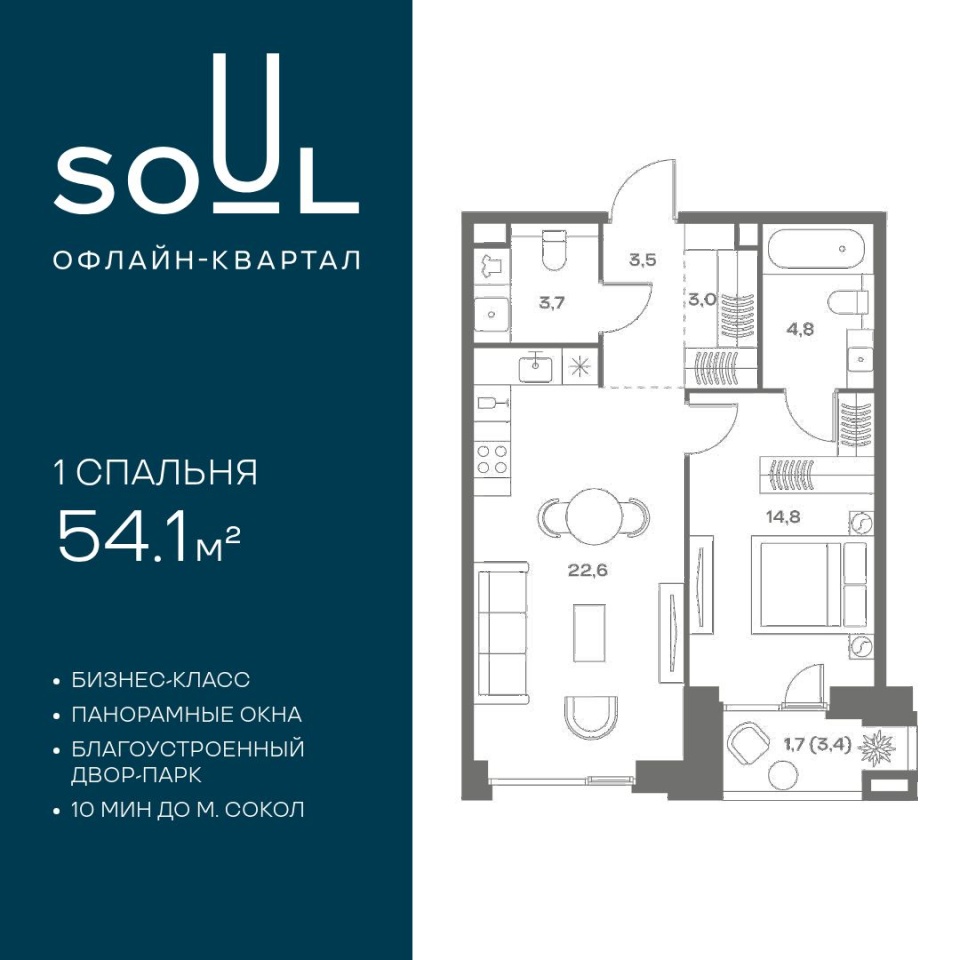 Цены указаны с условием 100% оплаты и стандартной ипотеки. Прямая продажа от застройщика. Продается 1-к. квартира номер 267 общей площадью 54.1 кв.м. на 5-м этаже 8 этажного дома, корпус UNIQUE (премиум-класс). Без отделки. Проект бизнес-класса SOUL от девелопера FORMA. До метро Сокол 10 мин пешком. Архитектура от британского бюро SimpsonHaugh. Благоустройство дворов — Gillespies и GAFA. Территория состоит из культурного парка и приватных дворов. Озеленение в эстетике лесного оазиса. Насыщенное благоустройство: прогулочные тропинки, релакс-зоны, пряный и сенсорный сады, развивающие детские площадки и воркауты. В центре проекта объект культурного наследия — общественное пространство Изофабрика, построенная в 30-х годах по проекту архитектора Георгия Гольца. Здесь будут располагаться мастерские для взрослых и детей, выставочные залы, коворкинги, образовательный центр, рестораны и кафе. Квартиры с панорамными окнами, мастер-спальнями, гардеробными, классическими балконами и лоджиями, видовыми террасами. Высота потолков от 2,9 до 3,5 м. В проекте 2 детских сада на 100 и 200 малышей. Клубная гостиная, фитнес-рум, детская игровая комната, дизайнерские лобби, подземный паркинг и келлеры.