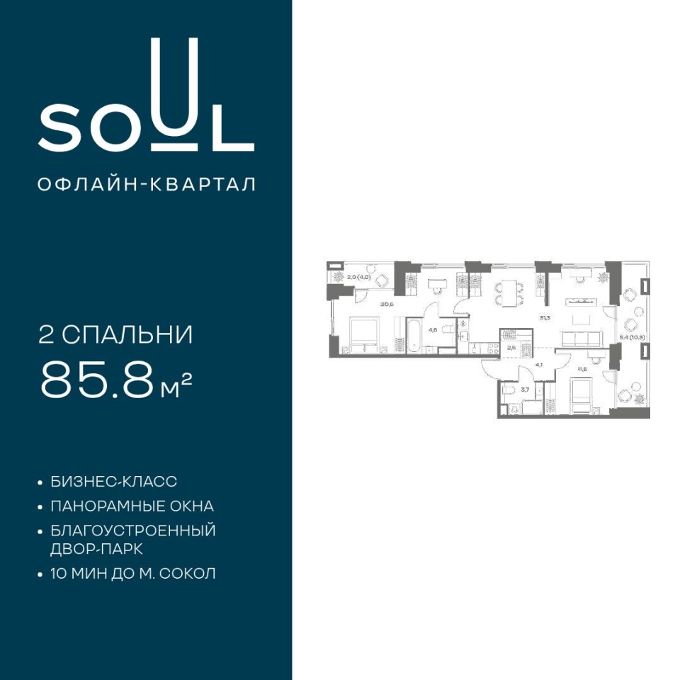 Цены указаны с условием 100% оплаты и стандартной ипотеки. Прямая продажа от застройщика. Продается 2-к. квартира номер 29 общей площадью 85.8 кв.м. на 5-м этаже 9 этажного дома, корпус UNIQUE (премиум-класс). Без отделки. Проект бизнес-класса SOUL от девелопера FORMA. До метро Сокол 10 мин пешком. Архитектура от британского бюро SimpsonHaugh. Благоустройство дворов — Gillespies и GAFA. Территория состоит из культурного парка и приватных дворов. Озеленение в эстетике лесного оазиса. Насыщенное благоустройство: прогулочные тропинки, релакс-зоны, пряный и сенсорный сады, развивающие детские площадки и воркауты. В центре проекта объект культурного наследия — общественное пространство Изофабрика, построенная в 30-х годах по проекту архитектора Георгия Гольца. Здесь будут располагаться мастерские для взрослых и детей, выставочные залы, коворкинги, образовательный центр, рестораны и кафе. Квартиры с панорамными окнами, мастер-спальнями, гардеробными, классическими балконами и лоджиями, видовыми террасами. Высота потолков от 2,9 до 3,5 м. В проекте 2 детских сада на 100 и 200 малышей. Клубная гостиная, фитнес-рум, детская игровая комната, дизайнерские лобби, подземный паркинг и келлеры.