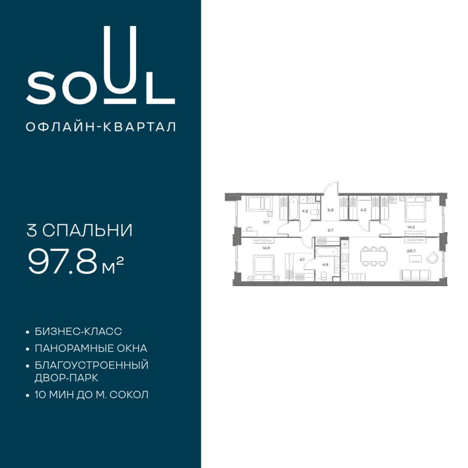 Цены указаны с условием 100% оплаты и стандартной ипотеки. Прямая продажа от застройщика. Продается 3-к. квартира квартира номер 292 общей площадью 97.8 кв.м. на 3-м этаже 9 этажного дома, Корпус 7. Без отделки. Проект бизнес-класса SOUL от девелопера FORMA. До метро Сокол 10 мин пешком. Архитектура от британского бюро SimpsonHaugh. Благоустройство дворов — Gillespies и GAFA. Территория состоит из культурного парка и приватных дворов. Озеленение в эстетике лесного оазиса. Насыщенное благоустройство: прогулочные тропинки, релакс-зоны, пряный и сенсорный сады, развивающие детские площадки и воркауты. В центре проекта объект культурного наследия — общественное пространство Изофабрика, построенная в 30-х годах по проекту архитектора Георгия Гольца. Здесь будут располагаться мастерские для взрослых и детей, выставочные залы, коворкинги, образовательный центр, рестораны и кафе. Квартиры с панорамными окнами, мастер-спальнями, гардеробными, классическими балконами и лоджиями, видовыми террасами. Высота потолков от 2,9 до 3,5 м. В проекте 2 детских сада на 100 и 200 малышей. Клубная гостиная, фитнес-рум, детская игровая комната, дизайнерские лобби, подземный паркинг и келлеры.