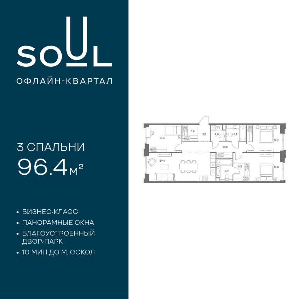 Цены указаны с условием 100% оплаты и стандартной ипотеки. Прямая продажа от застройщика. Продается 3-к. квартира номер 70 общей площадью 96.4 кв.м. на 5-м этаже 7 этажного дома, корпус UNIQUE (премиум-класс). Без отделки. Проект бизнес-класса SOUL от девелопера FORMA. До метро Сокол 10 мин пешком. Архитектура от британского бюро SimpsonHaugh. Благоустройство дворов — Gillespies и GAFA. Территория состоит из культурного парка и приватных дворов. Озеленение в эстетике лесного оазиса. Насыщенное благоустройство: прогулочные тропинки, релакс-зоны, пряный и сенсорный сады, развивающие детские площадки и воркауты. В центре проекта объект культурного наследия — общественное пространство Изофабрика, построенная в 30-х годах по проекту архитектора Георгия Гольца. Здесь будут располагаться мастерские для взрослых и детей, выставочные залы, коворкинги, образовательный центр, рестораны и кафе. Квартиры с панорамными окнами, мастер-спальнями, гардеробными, классическими балконами и лоджиями, видовыми террасами. Высота потолков от 2,9 до 3,5 м. В проекте 2 детских сада на 100 и 200 малышей. Клубная гостиная, фитнес-рум, детская игровая комната, дизайнерские лобби, подземный паркинг и келлеры.