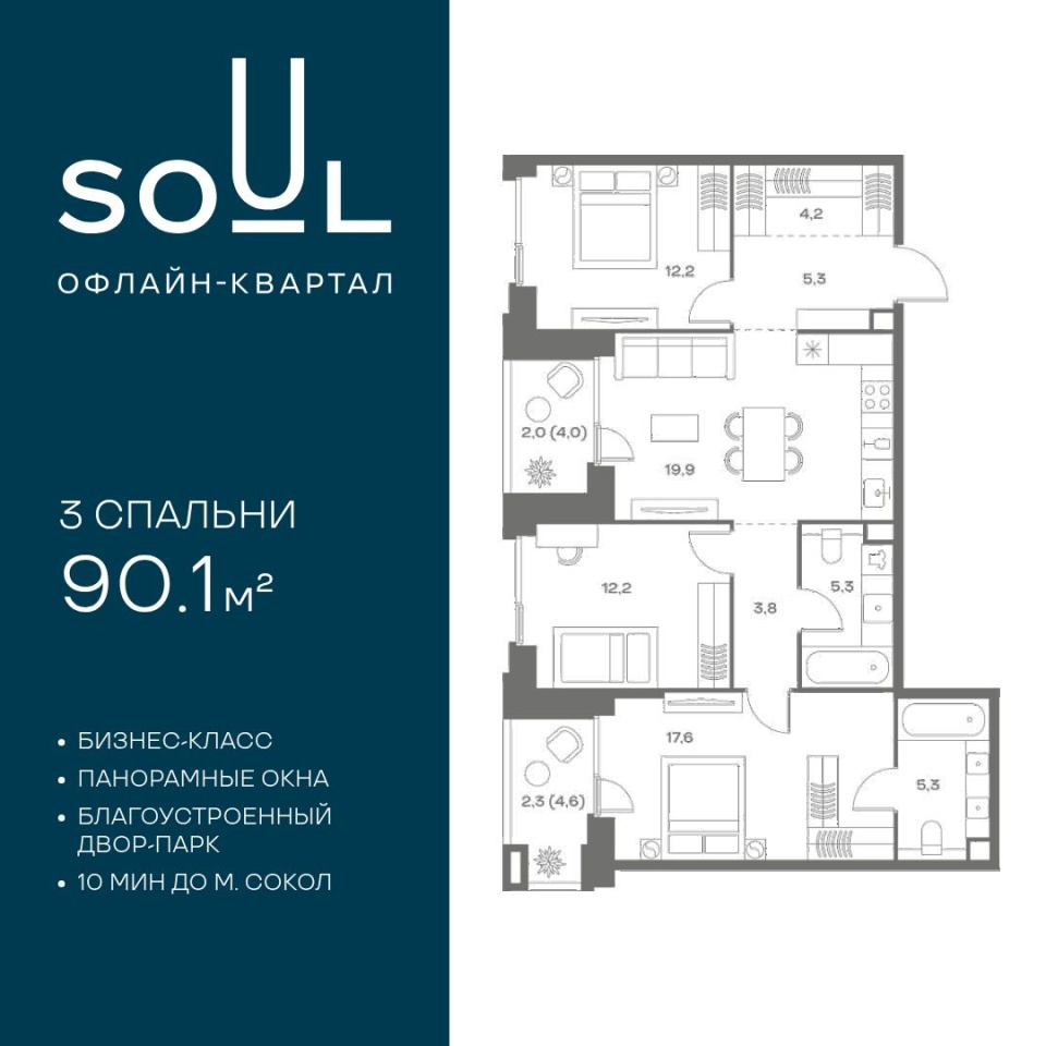Цены указаны с условием 100% оплаты и стандартной ипотеки. Прямая продажа от застройщика. Продается 3-к. квартира номер 264 общей площадью 90.1 кв.м. на 5-м этаже 8 этажного дома, корпус UNIQUE (премиум-класс). Без отделки. Проект бизнес-класса SOUL от девелопера FORMA. До метро Сокол 10 мин пешком. Архитектура от британского бюро SimpsonHaugh. Благоустройство дворов — Gillespies и GAFA. Территория состоит из культурного парка и приватных дворов. Озеленение в эстетике лесного оазиса. Насыщенное благоустройство: прогулочные тропинки, релакс-зоны, пряный и сенсорный сады, развивающие детские площадки и воркауты. В центре проекта объект культурного наследия — общественное пространство Изофабрика, построенная в 30-х годах по проекту архитектора Георгия Гольца. Здесь будут располагаться мастерские для взрослых и детей, выставочные залы, коворкинги, образовательный центр, рестораны и кафе. Квартиры с панорамными окнами, мастер-спальнями, гардеробными, классическими балконами и лоджиями, видовыми террасами. Высота потолков от 2,9 до 3,5 м. В проекте 2 детских сада на 100 и 200 малышей. Клубная гостиная, фитнес-рум, детская игровая комната, дизайнерские лобби, подземный паркинг и келлеры.