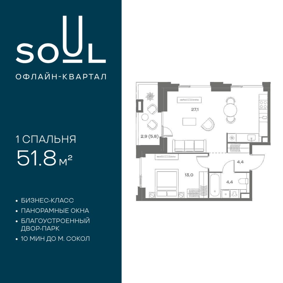 Цены указаны с условием 100% оплаты и стандартной ипотеки. Прямая продажа от застройщика. Продается 1-к. квартира квартира номер 296 общей площадью 51.8 кв.м. на 3-м этаже 9 этажного дома, Корпус 7. Без отделки. Проект бизнес-класса SOUL от девелопера FORMA. До метро Сокол 10 мин пешком. Архитектура от британского бюро SimpsonHaugh. Благоустройство дворов — Gillespies и GAFA. Территория состоит из культурного парка и приватных дворов. Озеленение в эстетике лесного оазиса. Насыщенное благоустройство: прогулочные тропинки, релакс-зоны, пряный и сенсорный сады, развивающие детские площадки и воркауты. В центре проекта объект культурного наследия — общественное пространство Изофабрика, построенная в 30-х годах по проекту архитектора Георгия Гольца. Здесь будут располагаться мастерские для взрослых и детей, выставочные залы, коворкинги, образовательный центр, рестораны и кафе. Квартиры с панорамными окнами, мастер-спальнями, гардеробными, классическими балконами и лоджиями, видовыми террасами. Высота потолков от 2,9 до 3,5 м. В проекте 2 детских сада на 100 и 200 малышей. Клубная гостиная, фитнес-рум, детская игровая комната, дизайнерские лобби, подземный паркинг и келлеры.