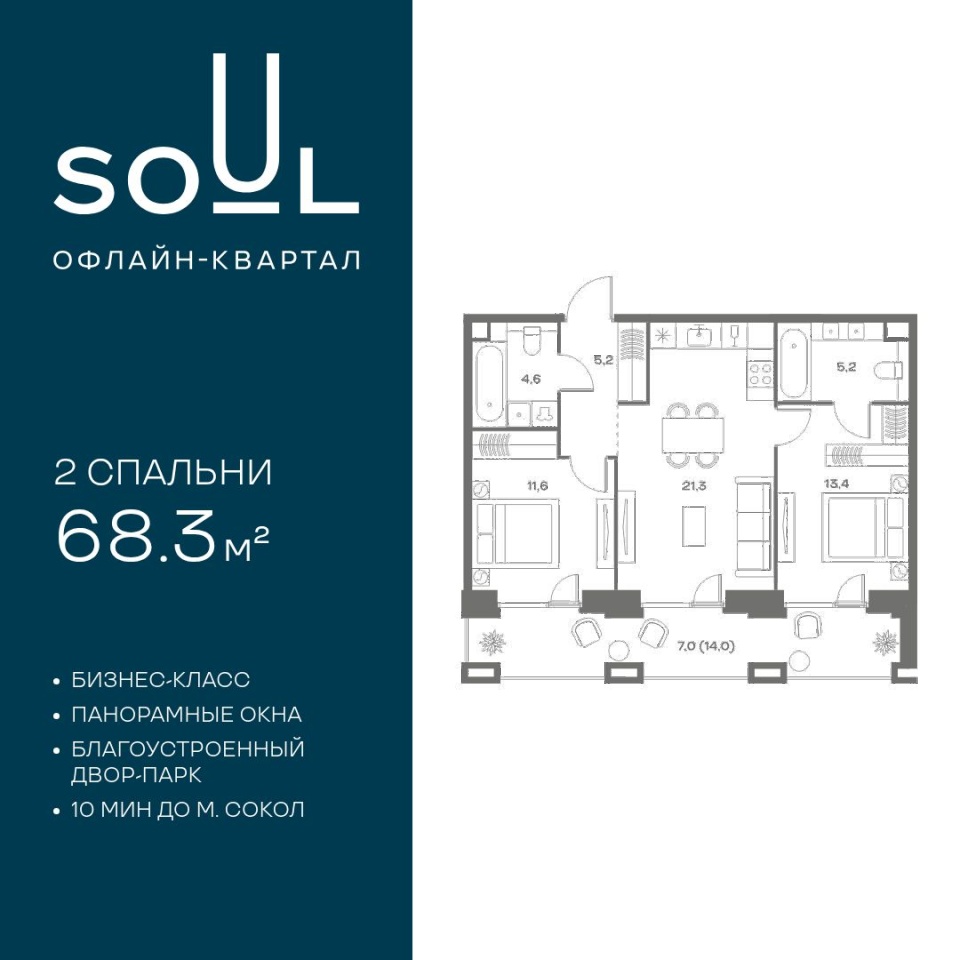 Цены указаны с условием 100% оплаты и стандартной ипотеки. Прямая продажа от застройщика. Продается 2-к. квартира квартира номер 191 общей площадью 68.3 кв.м. на 5-м этаже 7 этажного дома, Корпус 7. Без отделки. Проект бизнес-класса SOUL от девелопера FORMA. До метро Сокол 10 мин пешком. Архитектура от британского бюро SimpsonHaugh. Благоустройство дворов — Gillespies и GAFA. Территория состоит из культурного парка и приватных дворов. Озеленение в эстетике лесного оазиса. Насыщенное благоустройство: прогулочные тропинки, релакс-зоны, пряный и сенсорный сады, развивающие детские площадки и воркауты. В центре проекта объект культурного наследия — общественное пространство Изофабрика, построенная в 30-х годах по проекту архитектора Георгия Гольца. Здесь будут располагаться мастерские для взрослых и детей, выставочные залы, коворкинги, образовательный центр, рестораны и кафе. Квартиры с панорамными окнами, мастер-спальнями, гардеробными, классическими балконами и лоджиями, видовыми террасами. Высота потолков от 2,9 до 3,5 м. В проекте 2 детских сада на 100 и 200 малышей. Клубная гостиная, фитнес-рум, детская игровая комната, дизайнерские лобби, подземный паркинг и келлеры.