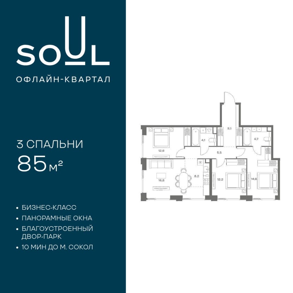 Цены указаны с условием 100% оплаты и стандартной ипотеки. Прямая продажа от застройщика. Продается 3-к. квартира номер 715 общей площадью 85 кв.м. на 12-м этаже 24 этажного дома, Корпус 9. С отделкой White Box Max. Проект бизнес-класса SOUL от девелопера FORMA. До метро Сокол 10 мин пешком. Архитектура от британского бюро SimpsonHaugh. Благоустройство дворов — Gillespies и GAFA. Территория состоит из культурного парка и приватных дворов. Озеленение в эстетике лесного оазиса. Насыщенное благоустройство: прогулочные тропинки, релакс-зоны, пряный и сенсорный сады, развивающие детские площадки и воркауты. В центре проекта объект культурного наследия — общественное пространство Изофабрика, построенная в 30-х годах по проекту архитектора Георгия Гольца. Здесь будут располагаться мастерские для взрослых и детей, выставочные залы, коворкинги, образовательный центр, рестораны и кафе. Квартиры с панорамными окнами, мастер-спальнями, гардеробными, классическими балконами и лоджиями, видовыми террасами. Высота потолков от 2,9 до 3,5 м. В проекте 2 детских сада на 100 и 200 малышей. Клубная гостиная, фитнес-рум, детская игровая комната, дизайнерские лобби, подземный паркинг и келлеры.