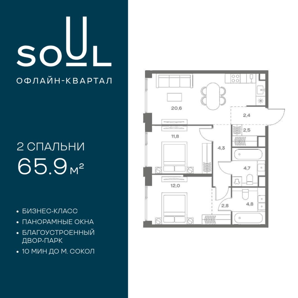 Цены указаны с условием 100% оплаты и стандартной ипотеки. Прямая продажа от застройщика. Продается 2-к. квартира номер 716 общей площадью 65.9 кв.м. на 12-м этаже 24 этажного дома, Корпус 9. С отделкой White Box Max. Проект бизнес-класса SOUL от девелопера FORMA. До метро Сокол 10 мин пешком. Архитектура от британского бюро SimpsonHaugh. Благоустройство дворов — Gillespies и GAFA. Территория состоит из культурного парка и приватных дворов. Озеленение в эстетике лесного оазиса. Насыщенное благоустройство: прогулочные тропинки, релакс-зоны, пряный и сенсорный сады, развивающие детские площадки и воркауты. В центре проекта объект культурного наследия — общественное пространство Изофабрика, построенная в 30-х годах по проекту архитектора Георгия Гольца. Здесь будут располагаться мастерские для взрослых и детей, выставочные залы, коворкинги, образовательный центр, рестораны и кафе. Квартиры с панорамными окнами, мастер-спальнями, гардеробными, классическими балконами и лоджиями, видовыми террасами. Высота потолков от 2,9 до 3,5 м. В проекте 2 детских сада на 100 и 200 малышей. Клубная гостиная, фитнес-рум, детская игровая комната, дизайнерские лобби, подземный паркинг и келлеры.