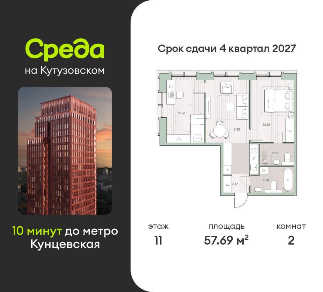 Квартира располагается на 11 этаже 12-этажного дома в ЖК Среда на Кутузовском.