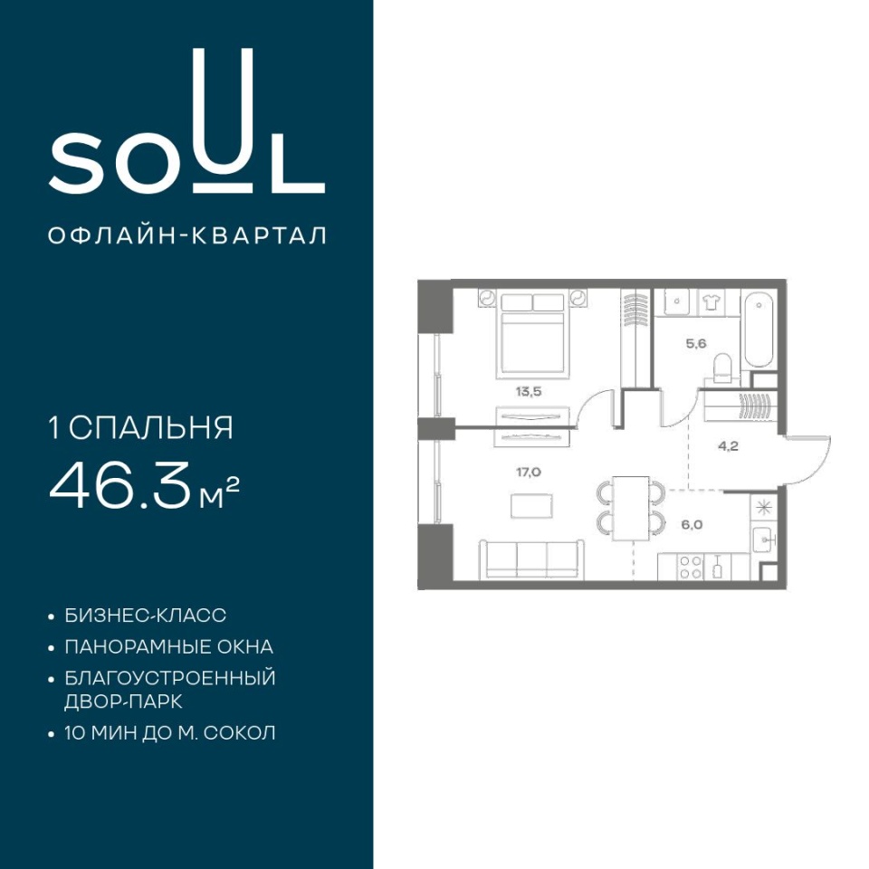 Цены указаны с условием 100% оплаты и стандартной ипотеки. Прямая продажа от застройщика. Продается 1-к. квартира номер 488 общей площадью 46.3 кв.м. на 12-м этаже 18 этажного дома, Корпус 8. Без отделки. Проект бизнес-класса SOUL от девелопера FORMA. До метро Сокол 10 мин пешком. Архитектура от британского бюро SimpsonHaugh. Благоустройство дворов — Gillespies и GAFA. Территория состоит из культурного парка и приватных дворов. Озеленение в эстетике лесного оазиса. Насыщенное благоустройство: прогулочные тропинки, релакс-зоны, пряный и сенсорный сады, развивающие детские площадки и воркауты. В центре проекта объект культурного наследия — общественное пространство Изофабрика, построенная в 30-х годах по проекту архитектора Георгия Гольца. Здесь будут располагаться мастерские для взрослых и детей, выставочные залы, коворкинги, образовательный центр, рестораны и кафе. Квартиры с панорамными окнами, мастер-спальнями, гардеробными, классическими балконами и лоджиями, видовыми террасами. Высота потолков от 2,9 до 3,5 м. В проекте 2 детских сада на 100 и 200 малышей. Клубная гостиная, фитнес-рум, детская игровая комната, дизайнерские лобби, подземный паркинг и келлеры.