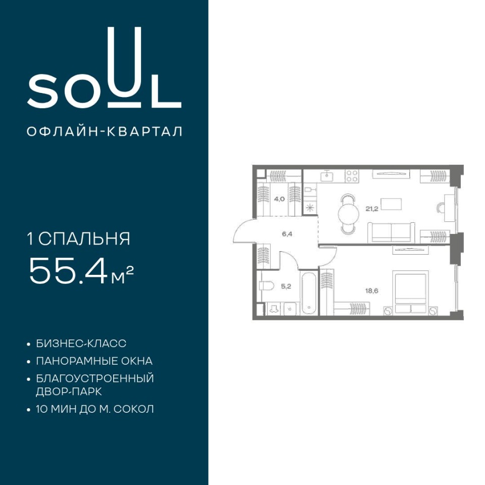 Цены указаны с условием 100% оплаты и стандартной ипотеки. Прямая продажа от застройщика. Продается 1-к. квартира номер 140 общей площадью 55.4 кв.м. на 5-м этаже 7 этажного дома, корпус UNIQUE (премиум-класс). Без отделки. Проект бизнес-класса SOUL от девелопера FORMA. До метро Сокол 10 мин пешком. Архитектура от британского бюро SimpsonHaugh. Благоустройство дворов — Gillespies и GAFA. Территория состоит из культурного парка и приватных дворов. Озеленение в эстетике лесного оазиса. Насыщенное благоустройство: прогулочные тропинки, релакс-зоны, пряный и сенсорный сады, развивающие детские площадки и воркауты. В центре проекта объект культурного наследия — общественное пространство Изофабрика, построенная в 30-х годах по проекту архитектора Георгия Гольца. Здесь будут располагаться мастерские для взрослых и детей, выставочные залы, коворкинги, образовательный центр, рестораны и кафе. Квартиры с панорамными окнами, мастер-спальнями, гардеробными, классическими балконами и лоджиями, видовыми террасами. Высота потолков от 2,9 до 3,5 м. В проекте 2 детских сада на 100 и 200 малышей. Клубная гостиная, фитнес-рум, детская игровая комната, дизайнерские лобби, подземный паркинг и келлеры.