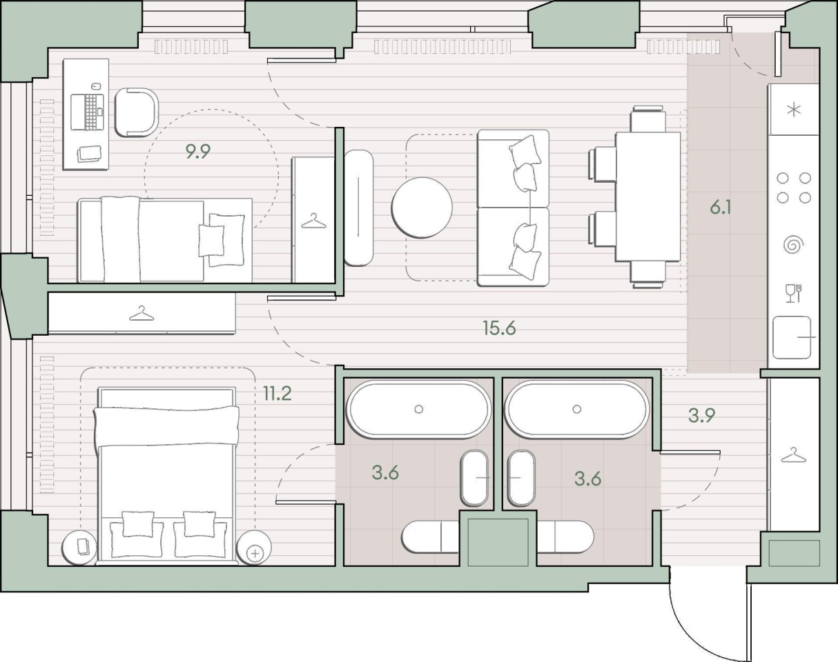 Жилая площадь 36.7 м2, кухня 6.1 м2, предчистовая отделка, комнаты изолированные.