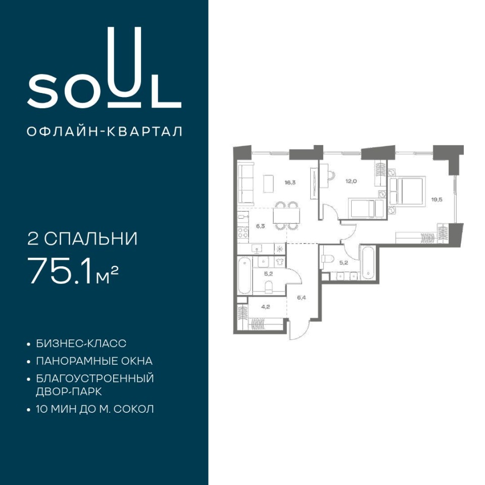 Цены указаны с условием 100% оплаты и стандартной ипотеки. Прямая продажа от застройщика. Продается 2-к. квартира номер 502 общей площадью 75.1 кв.м. на 14-м этаже 18 этажного дома, Корпус 8. Без отделки. Проект бизнес-класса SOUL от девелопера FORMA. До метро Сокол 10 мин пешком. Архитектура от британского бюро SimpsonHaugh. Благоустройство дворов — Gillespies и GAFA. Территория состоит из культурного парка и приватных дворов. Озеленение в эстетике лесного оазиса. Насыщенное благоустройство: прогулочные тропинки, релакс-зоны, пряный и сенсорный сады, развивающие детские площадки и воркауты. В центре проекта объект культурного наследия — общественное пространство Изофабрика, построенная в 30-х годах по проекту архитектора Георгия Гольца. Здесь будут располагаться мастерские для взрослых и детей, выставочные залы, коворкинги, образовательный центр, рестораны и кафе. Квартиры с панорамными окнами, мастер-спальнями, гардеробными, классическими балконами и лоджиями, видовыми террасами. Высота потолков от 2,9 до 3,5 м. В проекте 2 детских сада на 100 и 200 малышей. Клубная гостиная, фитнес-рум, детская игровая комната, дизайнерские лобби, подземный паркинг и келлеры.