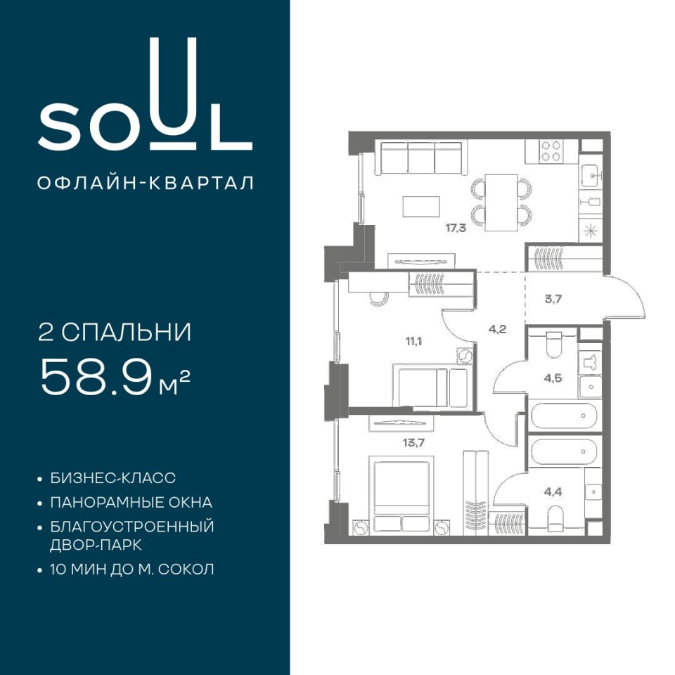 Цены указаны с условием 100% оплаты и стандартной ипотеки. Прямая продажа от застройщика. Продается 2-к. квартира квартира номер 293 общей площадью 58.9 кв.м. на 3-м этаже 9 этажного дома, Корпус 7. Без отделки. Проект бизнес-класса SOUL от девелопера FORMA. До метро Сокол 10 мин пешком. Архитектура от британского бюро SimpsonHaugh. Благоустройство дворов — Gillespies и GAFA. Территория состоит из культурного парка и приватных дворов. Озеленение в эстетике лесного оазиса. Насыщенное благоустройство: прогулочные тропинки, релакс-зоны, пряный и сенсорный сады, развивающие детские площадки и воркауты. В центре проекта объект культурного наследия — общественное пространство Изофабрика, построенная в 30-х годах по проекту архитектора Георгия Гольца. Здесь будут располагаться мастерские для взрослых и детей, выставочные залы, коворкинги, образовательный центр, рестораны и кафе. Квартиры с панорамными окнами, мастер-спальнями, гардеробными, классическими балконами и лоджиями, видовыми террасами. Высота потолков от 2,9 до 3,5 м. В проекте 2 детских сада на 100 и 200 малышей. Клубная гостиная, фитнес-рум, детская игровая комната, дизайнерские лобби, подземный паркинг и келлеры.