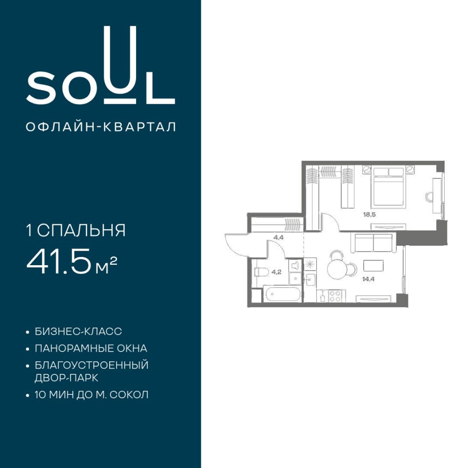 Цены указаны с условием 100% оплаты и стандартной ипотеки. Прямая продажа от застройщика. Продается 1-к. квартира номер 837 общей площадью 41.5 кв.м. на 22-м этаже 24 этажного дома, Корпус 9. С отделкой White Box Max. Проект бизнес-класса SOUL от девелопера FORMA. До метро Сокол 10 мин пешком. Архитектура от британского бюро SimpsonHaugh. Благоустройство дворов — Gillespies и GAFA. Территория состоит из культурного парка и приватных дворов. Озеленение в эстетике лесного оазиса. Насыщенное благоустройство: прогулочные тропинки, релакс-зоны, пряный и сенсорный сады, развивающие детские площадки и воркауты. В центре проекта объект культурного наследия — общественное пространство Изофабрика, построенная в 30-х годах по проекту архитектора Георгия Гольца. Здесь будут располагаться мастерские для взрослых и детей, выставочные залы, коворкинги, образовательный центр, рестораны и кафе. Квартиры с панорамными окнами, мастер-спальнями, гардеробными, классическими балконами и лоджиями, видовыми террасами. Высота потолков от 2,9 до 3,5 м. В проекте 2 детских сада на 100 и 200 малышей. Клубная гостиная, фитнес-рум, детская игровая комната, дизайнерские лобби, подземный паркинг и келлеры.