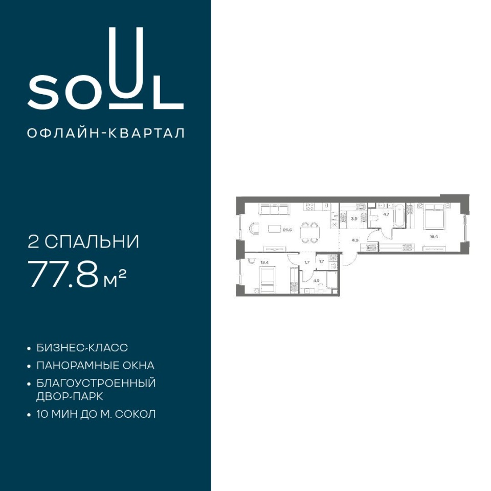 Цены указаны с условием 100% оплаты и стандартной ипотеки. Прямая продажа от застройщика. Продается 2-к. квартира номер 108 общей площадью 77.8 кв.м. на 5-м этаже 8 этажного дома, корпус UNIQUE (премиум-класс). Без отделки. Проект бизнес-класса SOUL от девелопера FORMA. До метро Сокол 10 мин пешком. Архитектура от британского бюро SimpsonHaugh. Благоустройство дворов — Gillespies и GAFA. Территория состоит из культурного парка и приватных дворов. Озеленение в эстетике лесного оазиса. Насыщенное благоустройство: прогулочные тропинки, релакс-зоны, пряный и сенсорный сады, развивающие детские площадки и воркауты. В центре проекта объект культурного наследия — общественное пространство Изофабрика, построенная в 30-х годах по проекту архитектора Георгия Гольца. Здесь будут располагаться мастерские для взрослых и детей, выставочные залы, коворкинги, образовательный центр, рестораны и кафе. Квартиры с панорамными окнами, мастер-спальнями, гардеробными, классическими балконами и лоджиями, видовыми террасами. Высота потолков от 2,9 до 3,5 м. В проекте 2 детских сада на 100 и 200 малышей. Клубная гостиная, фитнес-рум, детская игровая комната, дизайнерские лобби, подземный паркинг и келлеры.