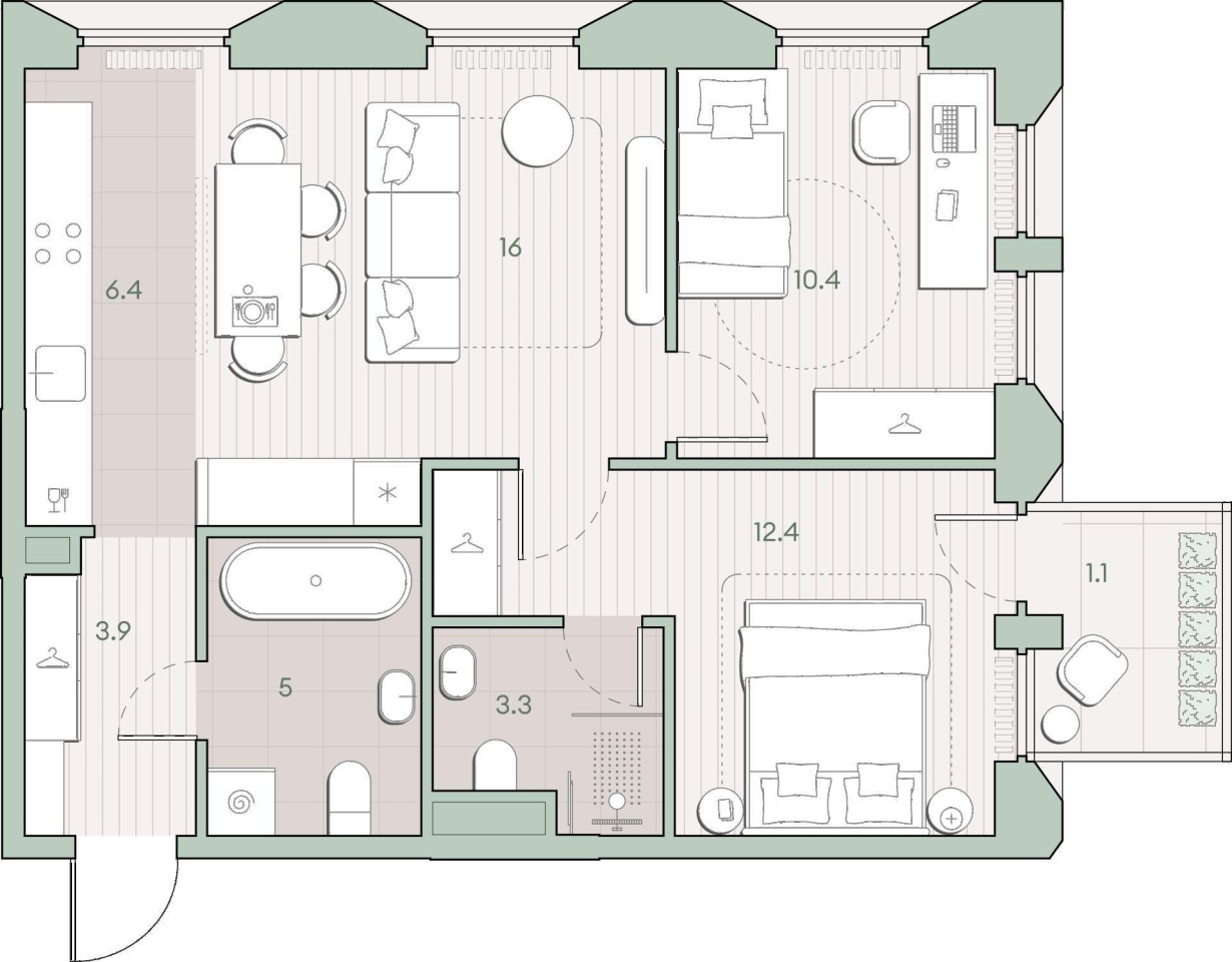 Жилая площадь 38.8 м2, предчистовая отделка, комнаты изолированные.