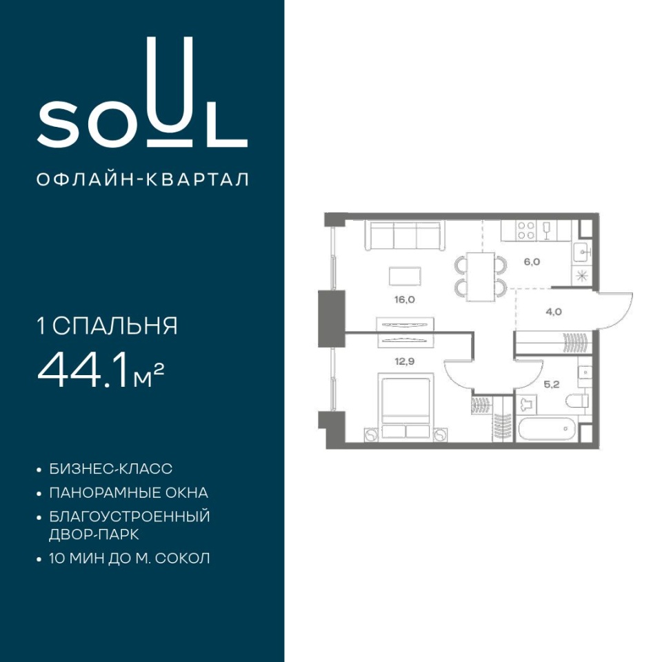 Цены указаны с условием 100% оплаты и стандартной ипотеки. Прямая продажа от застройщика. Продается 1-к. квартира номер 389 общей площадью 44.1 кв.м. на 5-м этаже 18 этажного дома, Корпус 8. Без отделки. Проект бизнес-класса SOUL от девелопера FORMA. До метро Сокол 10 мин пешком. Архитектура от британского бюро SimpsonHaugh. Благоустройство дворов — Gillespies и GAFA. Территория состоит из культурного парка и приватных дворов. Озеленение в эстетике лесного оазиса. Насыщенное благоустройство: прогулочные тропинки, релакс-зоны, пряный и сенсорный сады, развивающие детские площадки и воркауты. В центре проекта объект культурного наследия — общественное пространство Изофабрика, построенная в 30-х годах по проекту архитектора Георгия Гольца. Здесь будут располагаться мастерские для взрослых и детей, выставочные залы, коворкинги, образовательный центр, рестораны и кафе. Квартиры с панорамными окнами, мастер-спальнями, гардеробными, классическими балконами и лоджиями, видовыми террасами. Высота потолков от 2,9 до 3,5 м. В проекте 2 детских сада на 100 и 200 малышей. Клубная гостиная, фитнес-рум, детская игровая комната, дизайнерские лобби, подземный паркинг и келлеры.